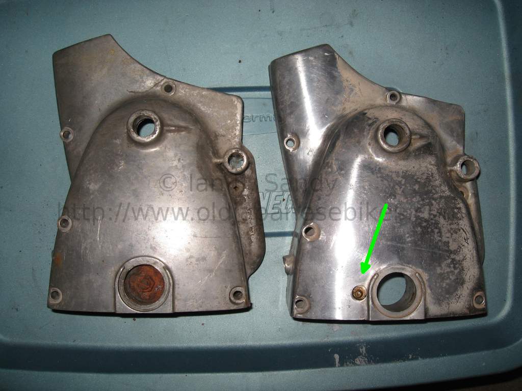 In the photo to the right, the cavity the arrow is pointing to holds the valve. You first have item 3 which is a small rubber gasket, then item 2 which is a small brass plug which normally would have a restriction orifice of about 0.5mm in it. This plug slides into the brass housing item 1, the head of which is what you can normally see when you look at the inside of the back plate. I have a box full of J/K fuel cocks for GT750′s – some are working correctly and others are seized up – on this one for the T500, item 2 was actually seized in the barrel (item 1) whether from having been mutilated or corrosion is difficult to say. If the valve is seized the fuel cock should still work – although probably would be slow to open and so restrict fuel flow initially. And if the orifice is plugged with spider web or something else, it won’t readily open at all and so starve the engine of fuel.