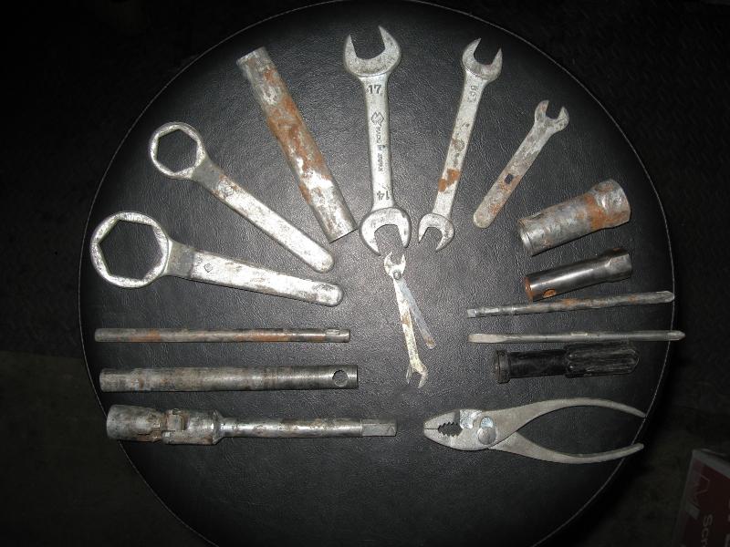 To the right is a photo of the tools from an early tool kit that I have pieced together - I have yet to confirm whether the original screw driver handles were black or red (I suspect they may have been red). Note the universal box wrench (part number 09816-00018) at the lower left. There are no visible manufacturer's marks on the ones I have - but presumably different suppliers were used as they differ slightly.
