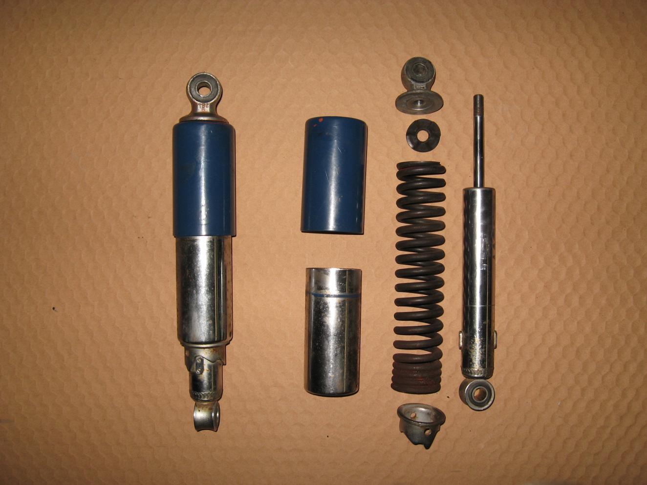Jim on the Sundial board was kind enough to post some 'how to' information on these specific shocks/dampers. Most of the Showa shocks used by Suzuki require you to depress the spring enough to be able to access a nut on the damper rod. Loosen that off and the upper eye-bolt fitting comes off and you then (very carefully) uncompress the spring and away you go. The MK I differs in that the painted shroud is threaded - if you try to compress it in a jig as you would for the later dampers, you will ruin the upper painted shroud. I was surprised at how easy they were to take apart - no doubt that will not be the case on reassembly !