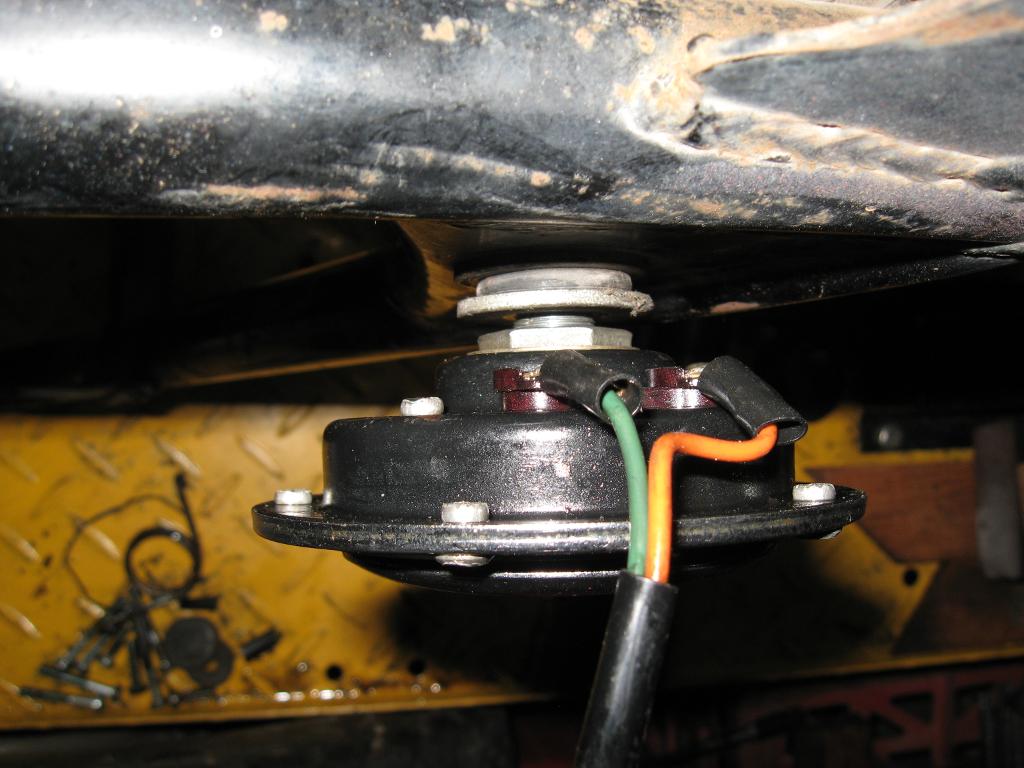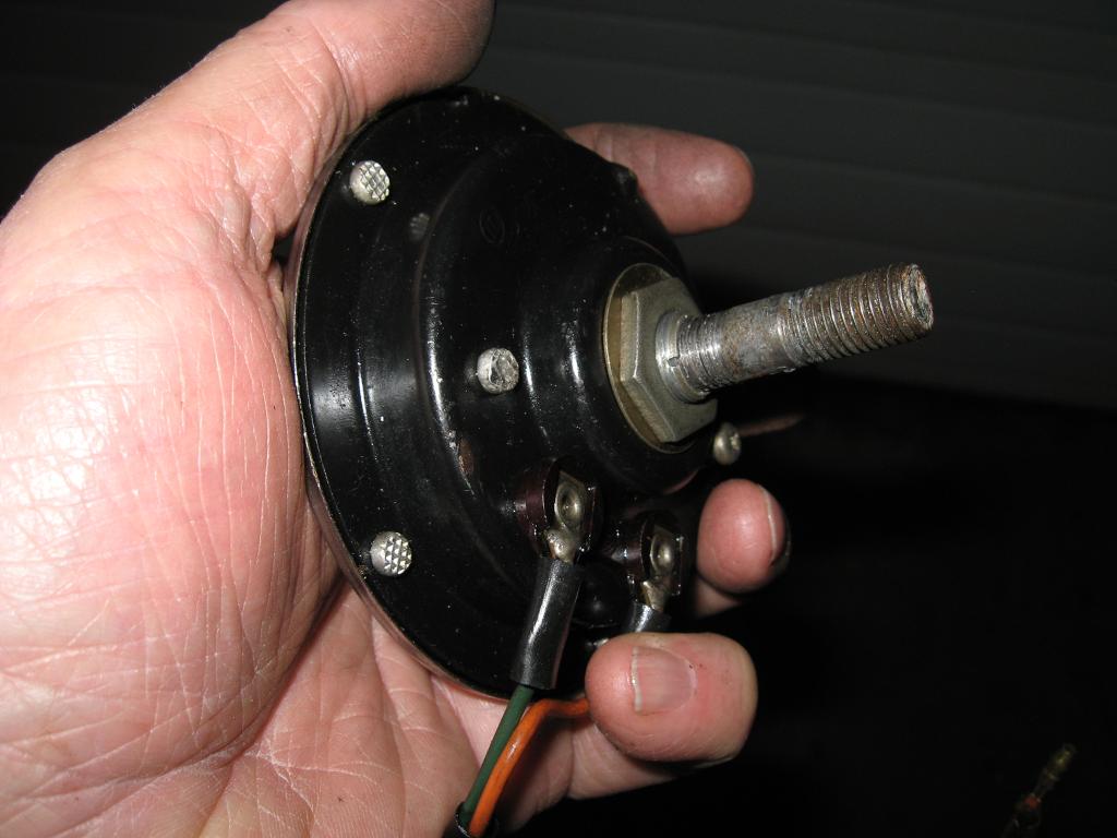The Suzuki MK I T500 Cobra had a horn that was mounted on a post that passed through a rubber bush on the frame just under the right front side of the fuel tank. This was changed with the MK II model to be a bracket mounted version. In photos I've seen two styles of horn for the MK I which were similar - what I had available to me was a (somewhat) working horn suitable for a 1972 model GT750 which appeared to have the same chrome face, but which mounted with a bracket. So I modified it !