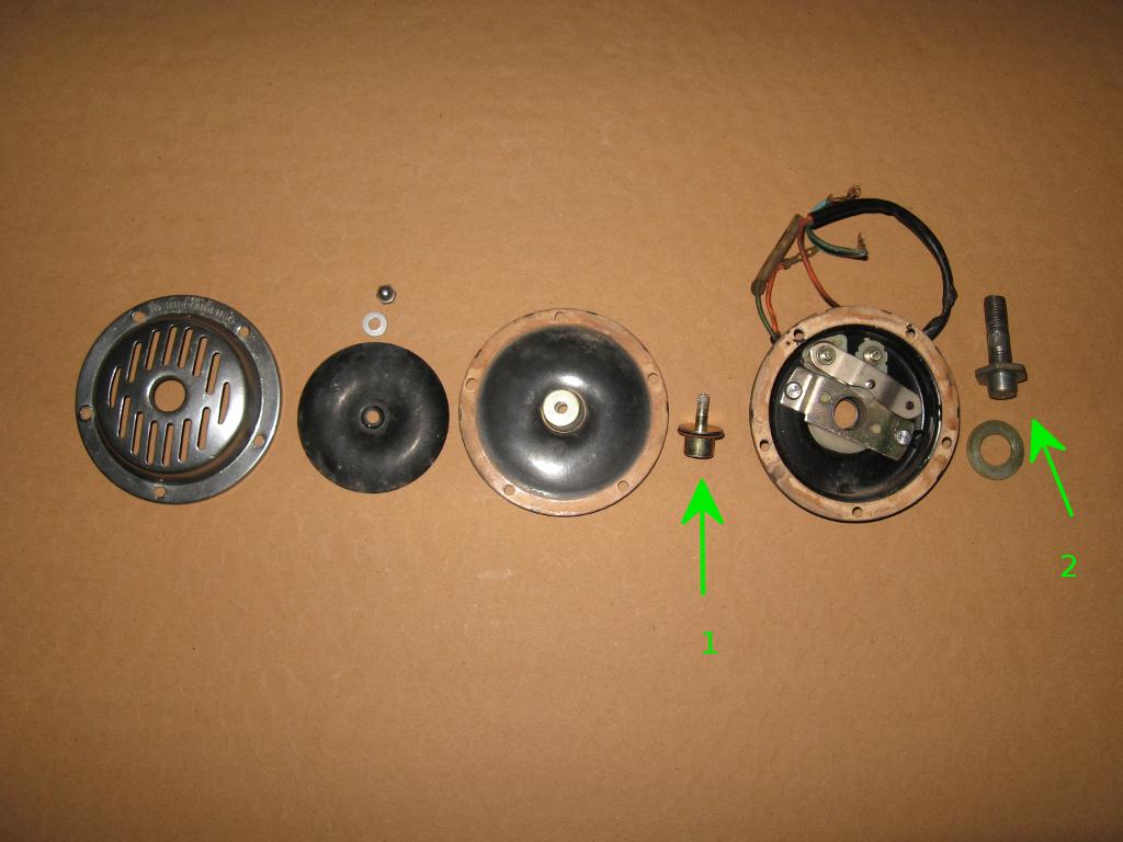 In the photo to the left below, you can see the MK I style of horn from a period advertising photo. Next to is is the disassembled horn I've modified - item #1 ,marks the moving part of the solenoid and item #2 is the moveable anvil it vibrates against. I drilled out the anvil and tapped it with a 10x1.25mm thread and made a stud of the right length for the bush in the frame. The centre and right photos show the stud and the horn once fixed in place. I have the horn face out to be re-chromed and will also paint the rest of the housing and then use either new aluminium rivets or possibly small stainless steel bolts to reassemble it.