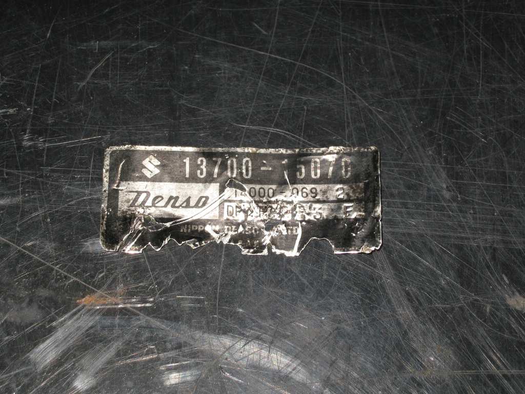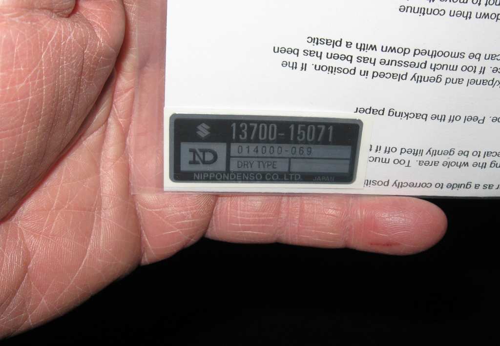 On the back of the airbox - right where it would get scraped by the battery mounting strap lug, is a foil Nippon Denso lable with the Suzuki part number which is 13700-15070. Reproduction Decals can supply a similar one - there appear to be perhaps three types. The one I have from them is a newer style but I've stuck it on - perhaps at some point I will have the original style recreated.