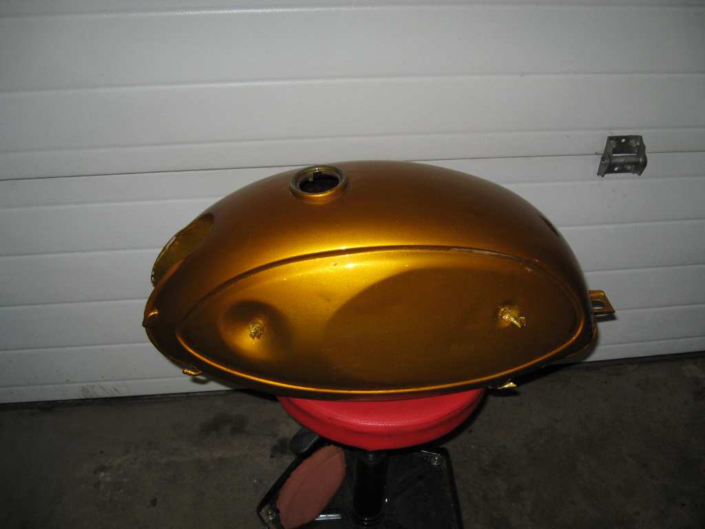 The bike as received was a blue colour, but here and there could be seen the original paint which was gold as offered for the MK I in 1968. To the right is a copy of the colour chart from the Suzuki parts manual covering the T500's up till 1972 - just click for a larger version.A close look at the tank had shown that it had been filled with body filler, and my hope was that underneath all of that the tank would be in good enough condition to use - it was a bit of a gamble, but after several hours and the removal of just over 2 kilos (4 1/2 pounds) of filler I was pleased to see that it actually looked quite good, and the threads for mounting the side panels are intact ! In the middle photo below you can see the original chrome side panel mounted back on the tank for the first time in many years, together with some of the filler I removed.