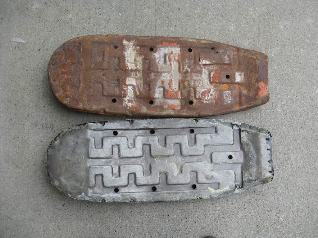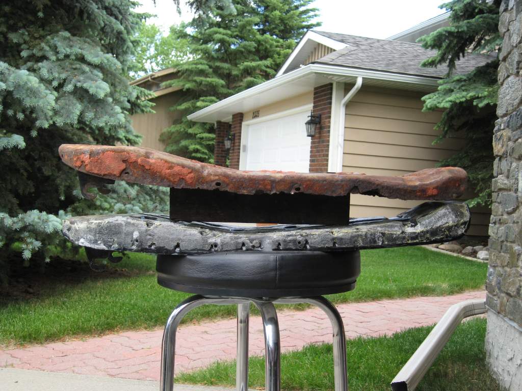 After even more emails, the pans finally arrived back here in Calgary, and I admit that I was pleasantly surprised ! The new one is a pretty faithful copy of the old one and fits not too badly at all. In the photo at the top, the old original is in the upper half and the reproduction pan is below it. As you can see the new pan has been hand formed – basically a sheet of thin gauge steel has been pounded into the right shape using a hammer and dolly. As a result, it is not a 100% faithful copy – the edges of the pattern are not crisp for example – but it is a good likeness. The second photo to the upper right shows the two pans – original on top, new one below it – and as can be seen, the profile is very close to being the same. The one thing I’d ask for next time is for a stiffener to be spot welded around the inside edge as I’m not as svelte as I used to be, and I think some added rigidity would be wise (note that the original one did have this) . Of course, when the pan is covered, and bolted to the frame (this model does not have a hinged seat) you can’t even see the underside of the pan once it is installed – certainly not the top either – so really, so long as the profile is good and the shape is correct then frankly I’m OK with it.
