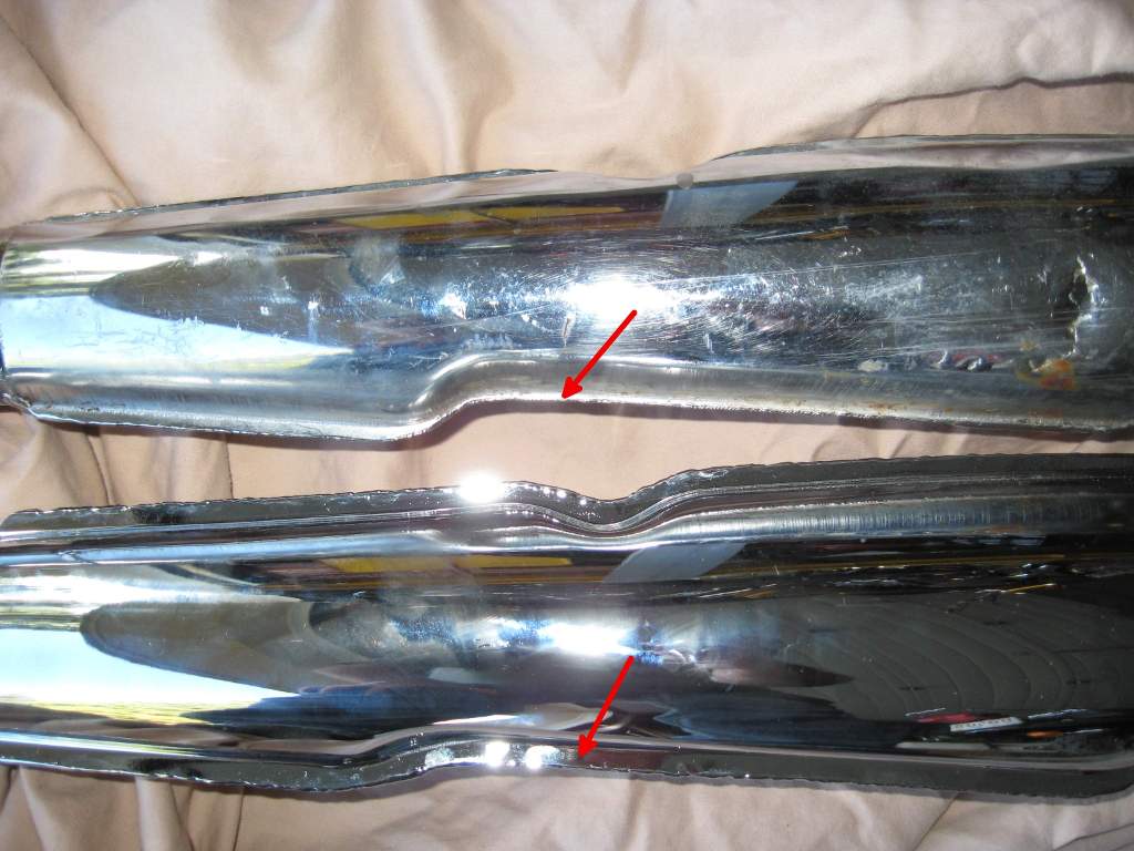 This meant that when mounted on the bike, the mufflers I received (I have no way to know if this is true for all the ones Marcel sells) were tight to the lower frame rail, and the lower weld flange was in the way of the side stand so it could not be mounted. In the photo below, the arrow points to an original muffler on the top and the lower weld flange/seam - you can see its almost non-existent. On the reproduction muffler below it you can see that the flange is quite wide and extends about 8 mm further than the one above.