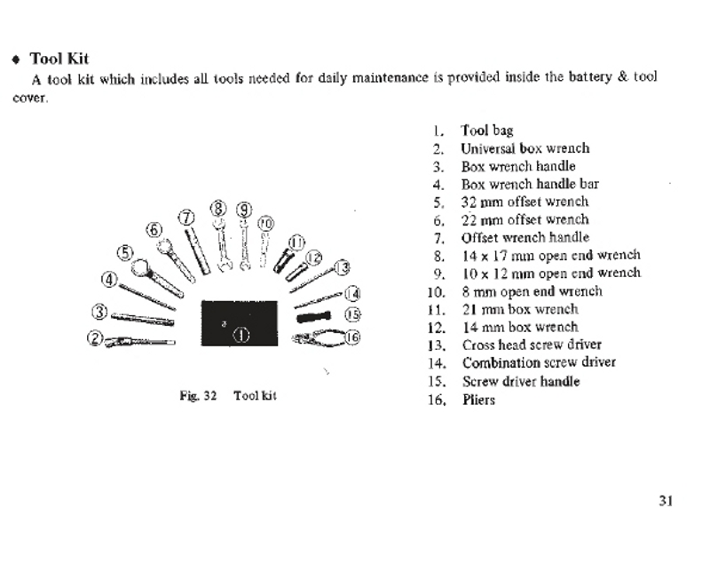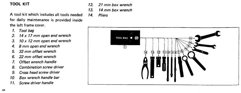 The early kits included with the Suzuki T500 models, up to the 1973 K models (to be confirmed) included a box wrench having a universal joint and a removable handle.which were items 2 and 3 in the left photo below. These were definitely no longer included by the 1975 M series tool kits. The contact points file (part 09813-00001) appears to have been included up until the R series in 1971, and as an option in 1972 - beyond that the parts manuals I have do not list them. The points wrench (09930-20111) appears to have been included up to the J models (to be confirmed) and then as an option beginning with the K in 1973. To the right is an early kit supplied with K models - included item 2 and 3 for total of 16 pieces (just click to see a larger version).And this is a copy from the owner's manual of a kit supplied with the M model Titan and GT's - 14 pieces.