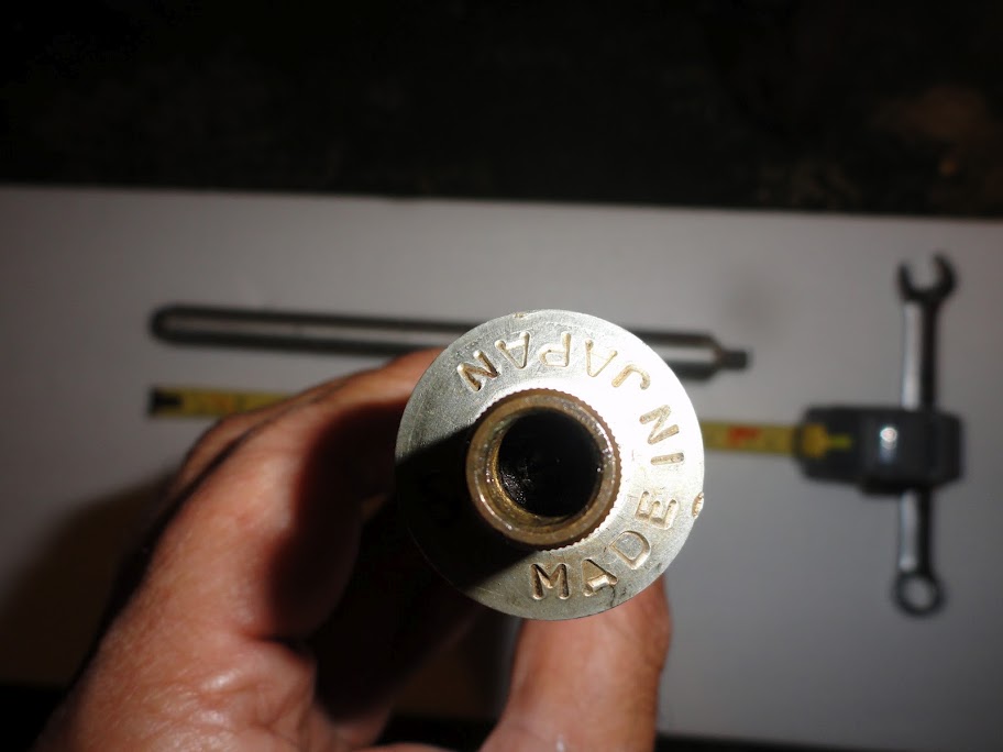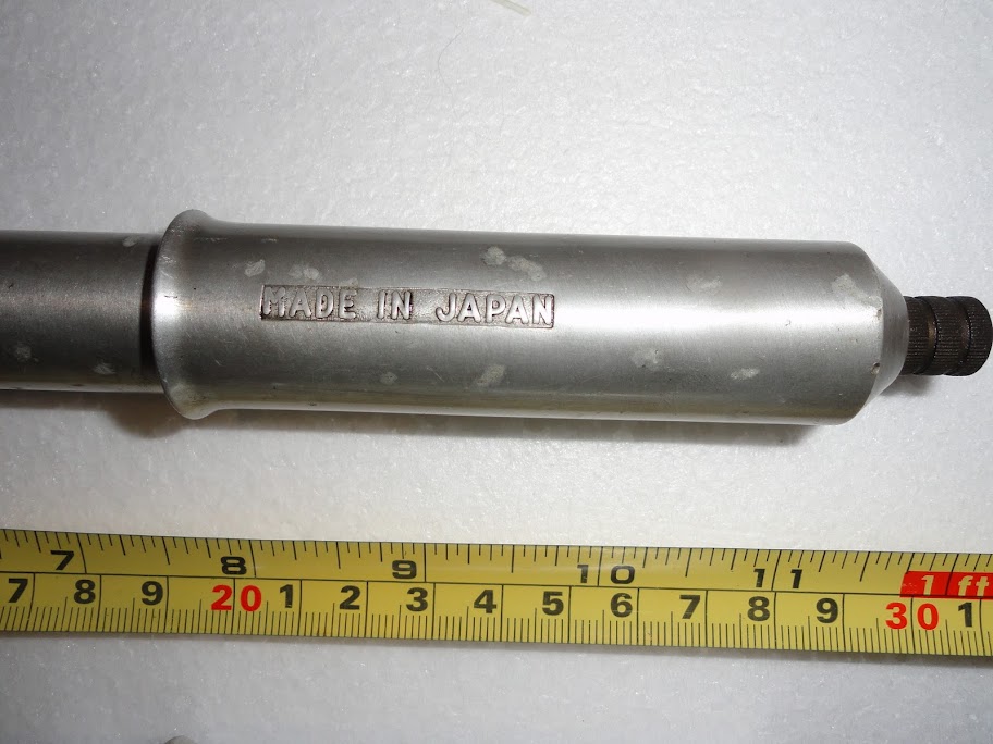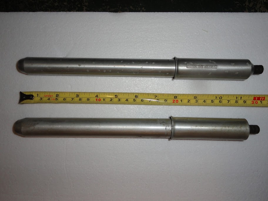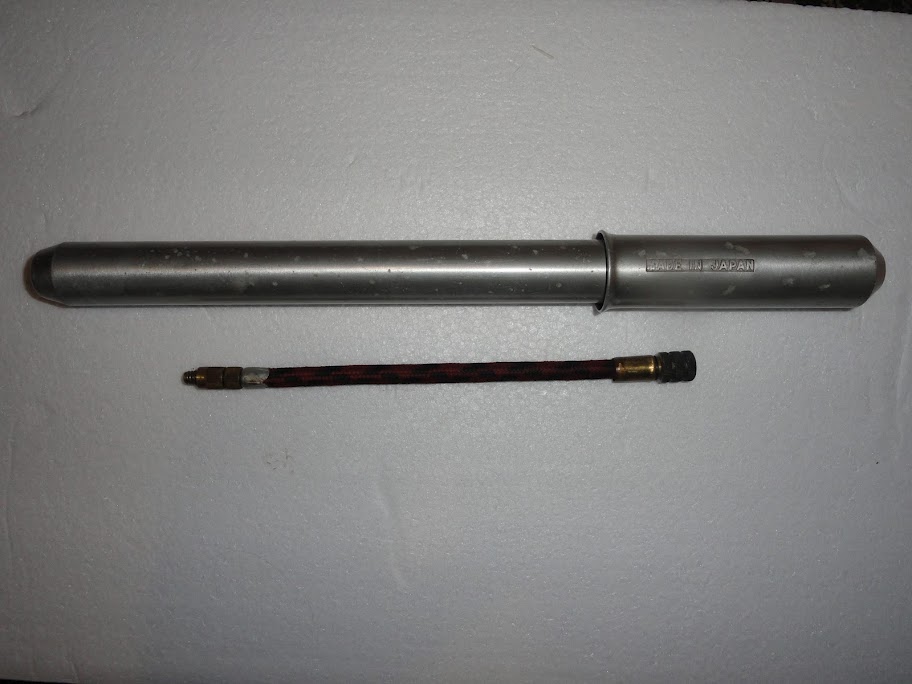 There were at least two styles of tire pump fitted to the early T500's - the one at the top of the photo on the left has 'Made in Japan' printed length ways on the pump handle and came from a first year T500, and the one in the lower part of the photo has 'Made in Japan' printed on the end of the handle , wrapped around where the nozzle is stored. Both pumps are the same length of 20 cm, uncompressed with the nozzle protruding another 1 cm. The pump casings were made of aluminium.