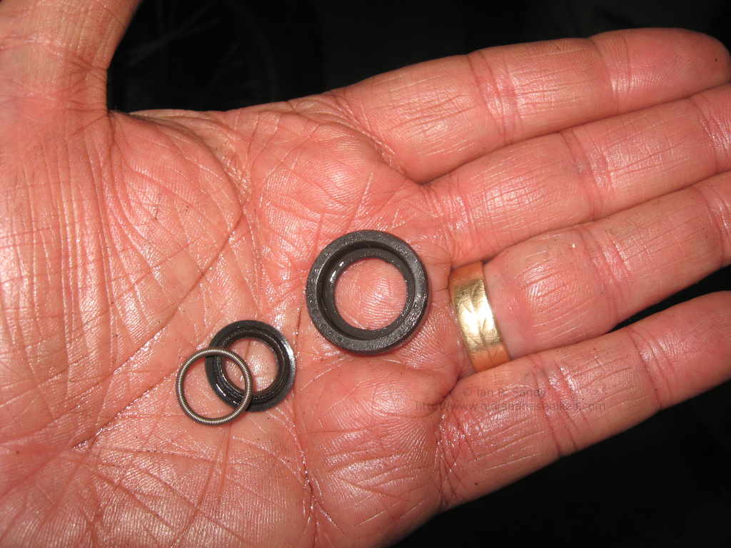 The engine fired up 'on the button' and sounded very healthy - other than all the oil dripping out the weep hole on the water pump cover. At first I was concerned that the small plastic drain line from the vent space in the water pump had cracked - they are getting to be a bit ancient now after all. If that had been the problem then the only way to repair it would have been to pull the engine and tear it down again completely as one end of the drain line is located under the shifter drum. I noticed that the oil was only dripping when the engine had fully warmed up, so I decided to first pull the water pump and double check the top oil seal. This I found in three pieces and so not sealing at all ! After replacing it and then very carefully reassembling the water pump it tested OK and the engine was oil tight.