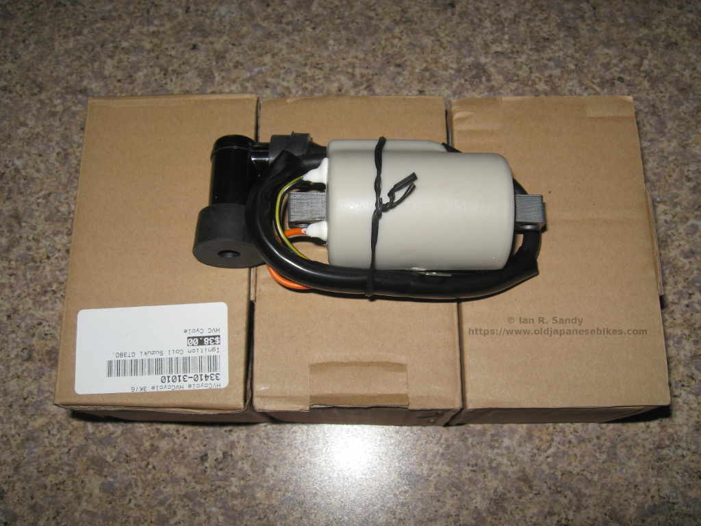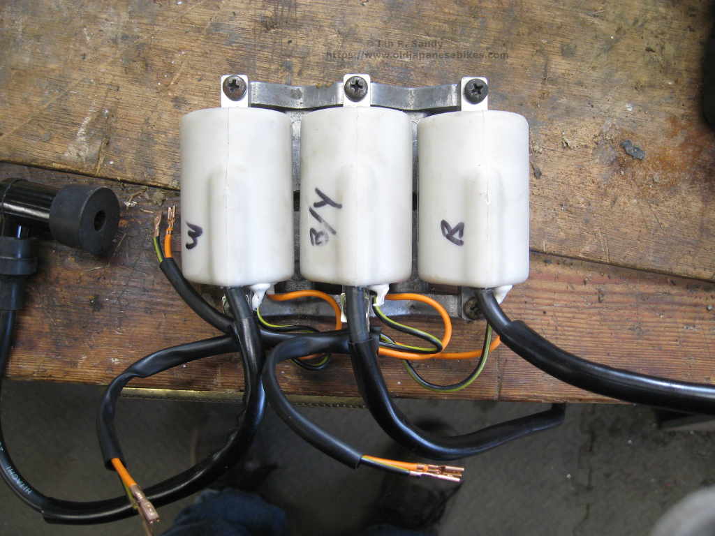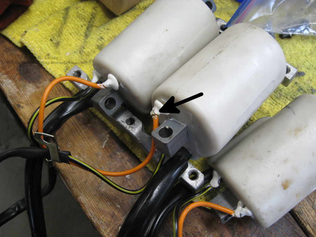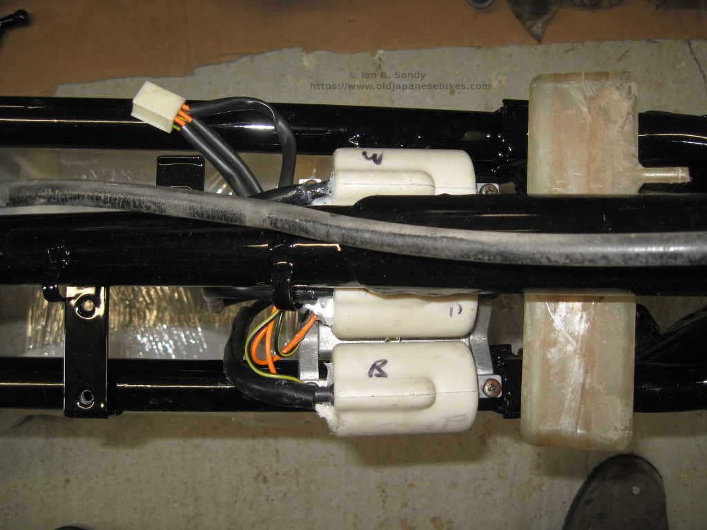First of all (and had I thought about it I would have realised this) the wiring colours were the same on each coil. Not a big deal and I figured it out with little difficultly. Once I had it all together, I just did a quick ohm check so be sure the coils were all wired correctly and found that I had a dead short between power and ground. Further investigation showed that the power lead was interfering with the mount cradle which was a bit annoying as these are sold as direct replacements for the Suzuki GT750 coils. I had to relieve the cradle as shown in the photo to ensure I had clearance and then reseal the damaged leads with silicone. Less haste - more speed as they say and if I'd just taken a moment to check this when originally mounting them I would have saved myself some work. Lesson learned !