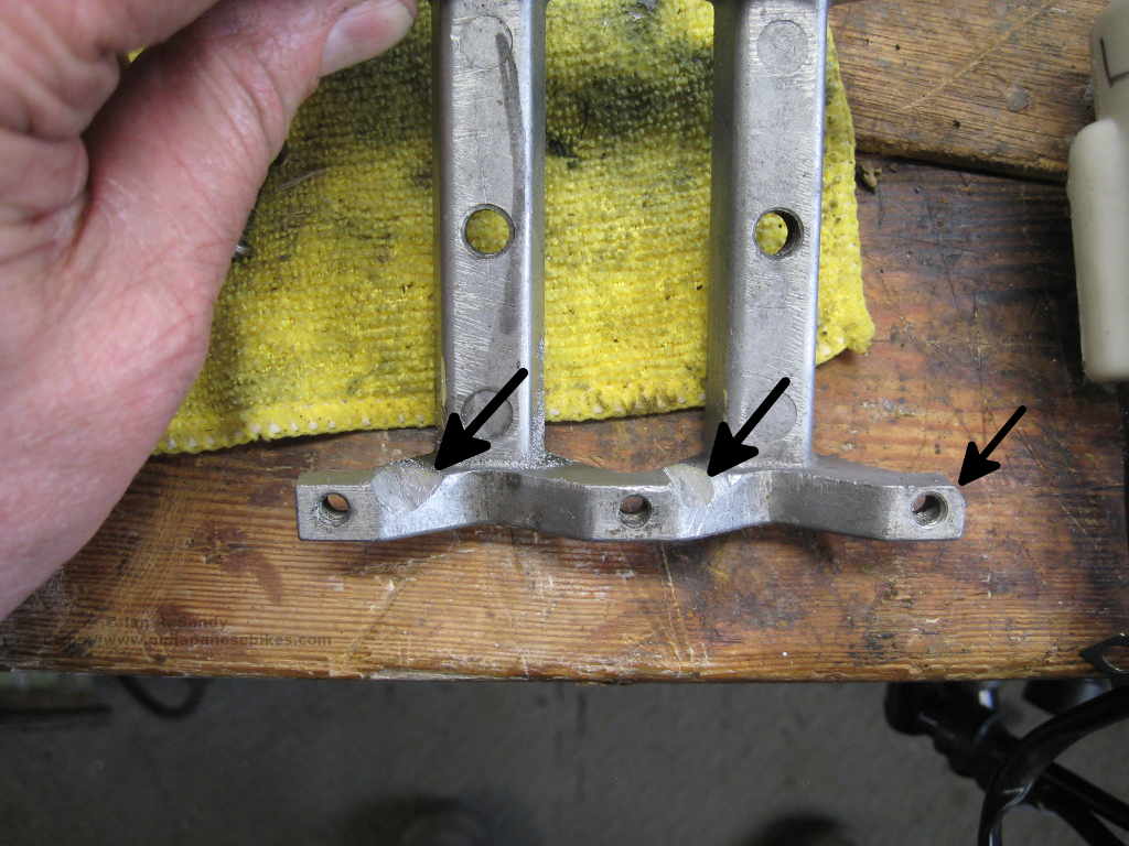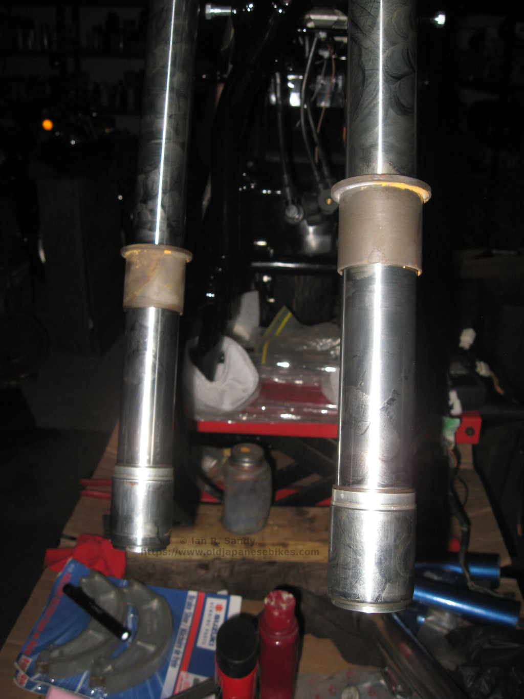 I've had a set of new fork tubes/stanchions from CruzinImage sitting on the shelf for years waiting for exactly this opportunity and then recalled why it is Mitsuo hasn't offered them since then ! Basically the diameter of the tube at the lower end where the valve fits over it is too big. The tubes otherwise are very well made and chromed all the way to the top so the usual rust and pitting problems you see on the area covered by the fork ears should never be an issue with these, but making the bits fit together was a bit like working on a British bike as everything had to be fiddled with.