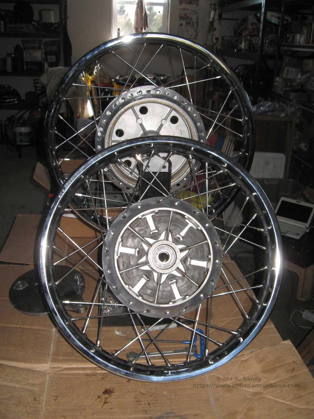 I used new steel rims from Suzuki, although I don't really care for the big "EXCEL" stamped in the side of the flange. I positioned it on both wheels to be on the left side of the bike so they wouldn't be as easily seen when it is sitting on the side stand. The stainless steel spokes I ordered from Waldridge Motors Ltd. as they are just around the corner from me here in London, Ontario. They buy them from Central Wheel in the UK and the cost was less than ordering from Buchanans in the USA, while the quality appears to be the same. The fit was fine and they laced up with no issues. The tires are IRC GS-11(AW)'s that Terry at Wolfe Worx ordered in for me. These are 'inch' sized tube tires so the profile looks correct when they are fitted, and I've found that they work well on the GT750.