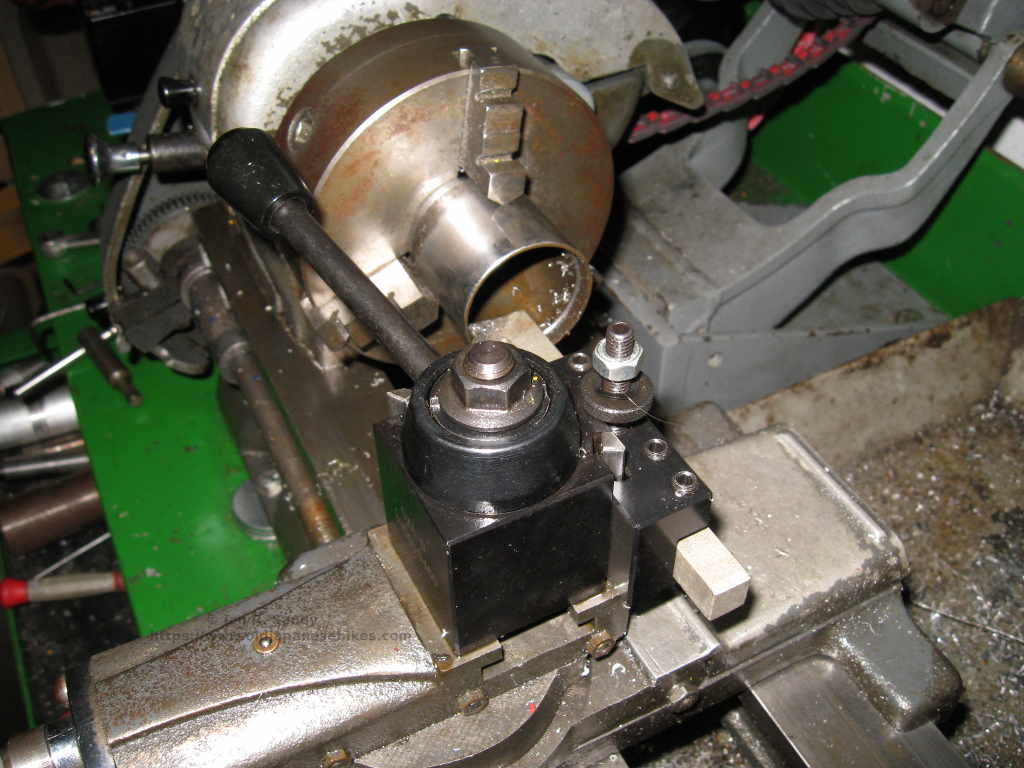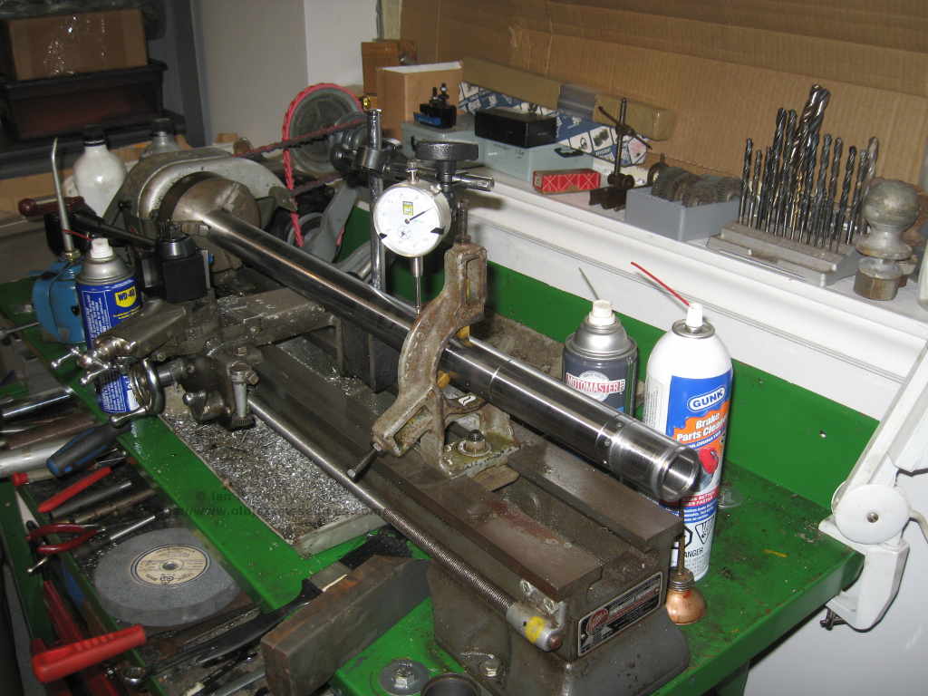 The plan was to grind down the over sized part on the lathe, which posed a small problem as my little lathe has too small a through hole in the head stock. I managed to mount the tubes using a steady rest and ground down the chrome the amount I needed. Then I had to turn a small step in the valve to get it to seat properly as the circlip sat too high in the groove due to the diameter being just a hair too big. After it was all done I had a very nice looking set of tubes and could move on to the next step of getting the wheel mounts etc. and do a dry fit of the headlight ears and bucket just to be sure everything actually did fit.