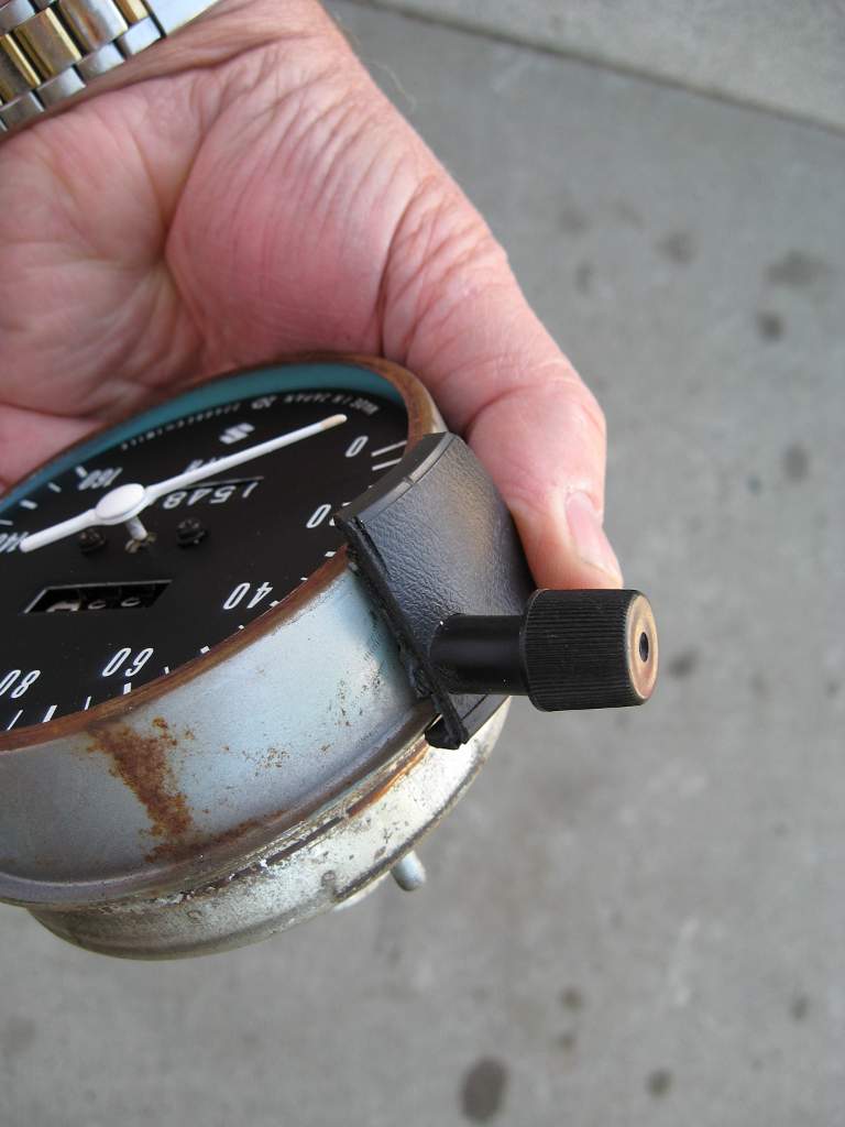 The new shells are perfectly round, so spend some time to check that the new shell does not bind on the metal base plate of the instrument housing - if it does, file or sand the outside diameter of the metal base plate where it binds to ensure a proper fit to the shell. The locator tab in the new shell will align your inside green sleeve, the shell and the base plate properly. With your new shell fitted, thread in your trip reset knob on the speedometer (don't forget that it is a reverse thread), seal the base of the shell with black silicon sealant, and you are ready to go !