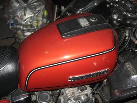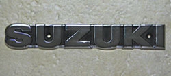 | The tank badges used block letters for the 'Suzuki' text, in raised chrome, and matt black fill between the letters and secured with two screws. The tops and bottoms of the letters extend just past the lower black background. The frame side covers said 'GT750' with the 'GT' having metallic orange fill in the letters with a polished surround. The numbers were raised and polished and a matt black painted fill was used to highlight both the letters and numbers. |