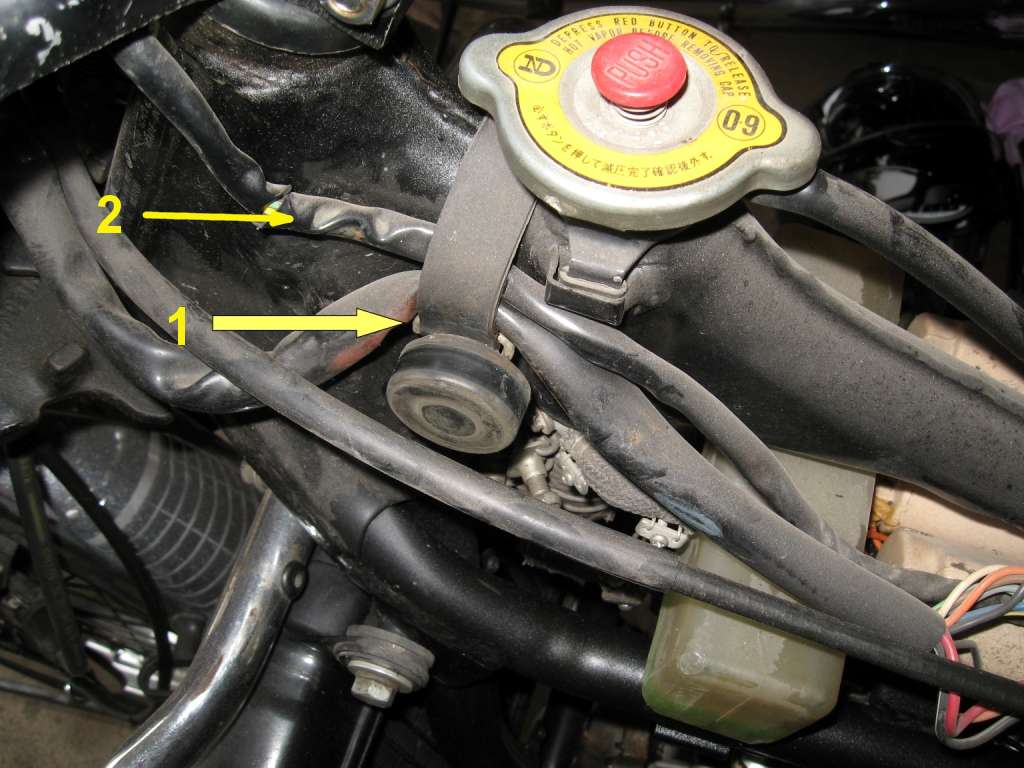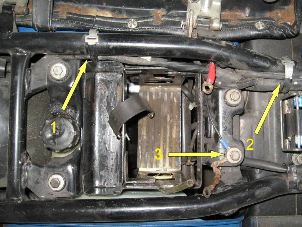 - Again, if no fan is fitted the leads for the fan temperature sensor are tied up and secured to the frame back bone (4), and there is also one clip usually between this point, and the battery indicated as 3.
