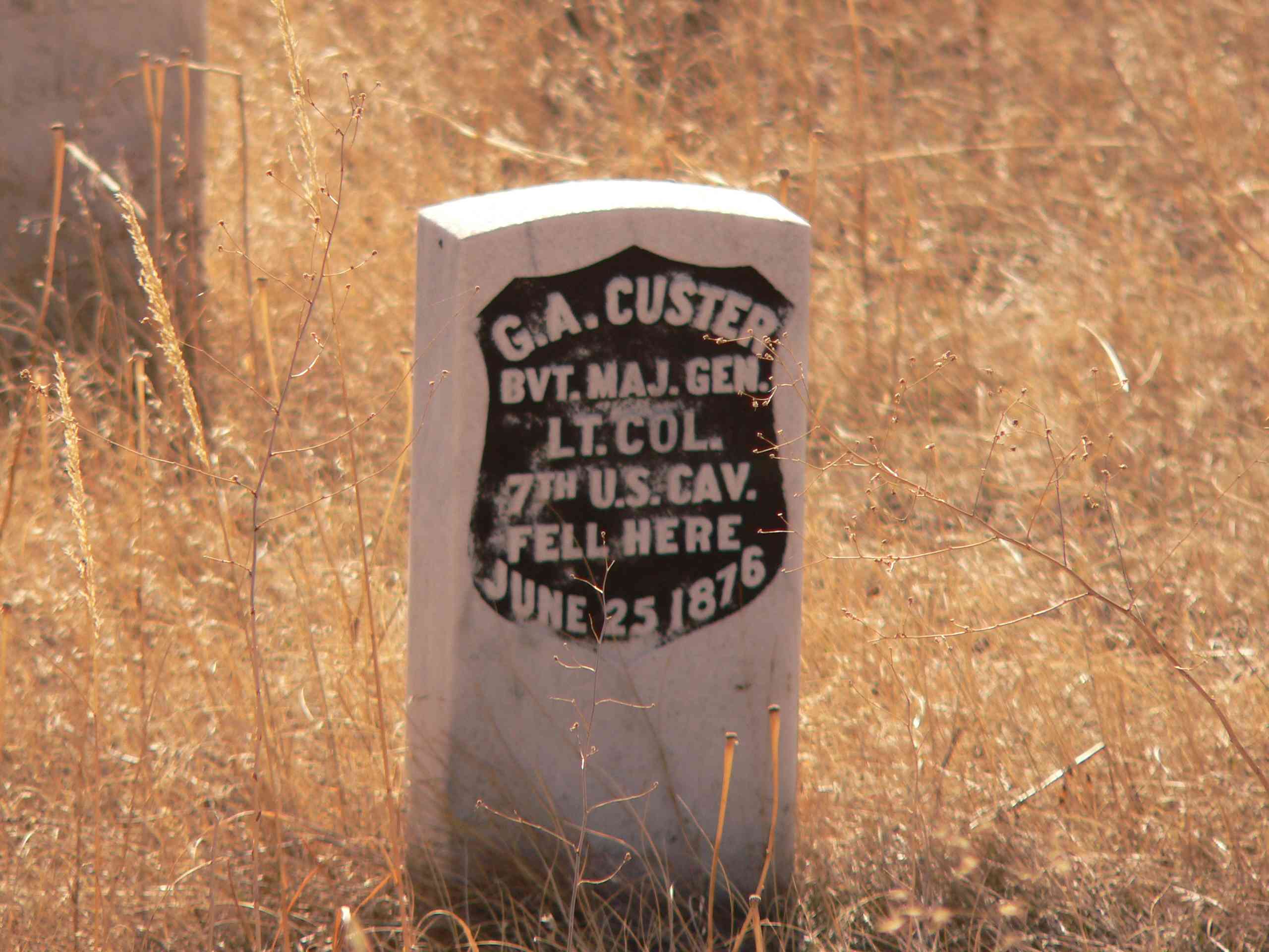The site where Custer fell is on the south slope, just below the top of a ridge that runs more or less west to the east on the north side of the Little Big Horn River. Below the ridge, down at the river on the south side was the native encampment of some several thousand men, women and children predominately from the Lakota and Northern Cheyenne tribes. The 7th Cavalry had about 700 men. The battle took place over two days, and at the end of the day June 26th, 1876, 268 Cavalry men, plus horses and an unknown number of natives were dead. Today, it is a peaceful, almost thoughtful place with markers showing where bodies were found. This is not the manicured grave site one sees in France or Belgium, with rows and rows of well-ordered markers all tidily arranged – here each stone marker is placed where the body was found and so as you look down the slope, you can easily envision the last desperate moments of each combatant on both sides as the markers either singly, or clustered in small haphazard groupings are strewn here and there on the grassy slopes and ravines down toward the river. The single markers in some ways are the most poignant – you start to notice them slowly, as your eye picks them out of the tall grasses here and there where they fell, both the red granite ones for the natives and white marble ones for the cavalrymen. I’m glad I visited – recommended.