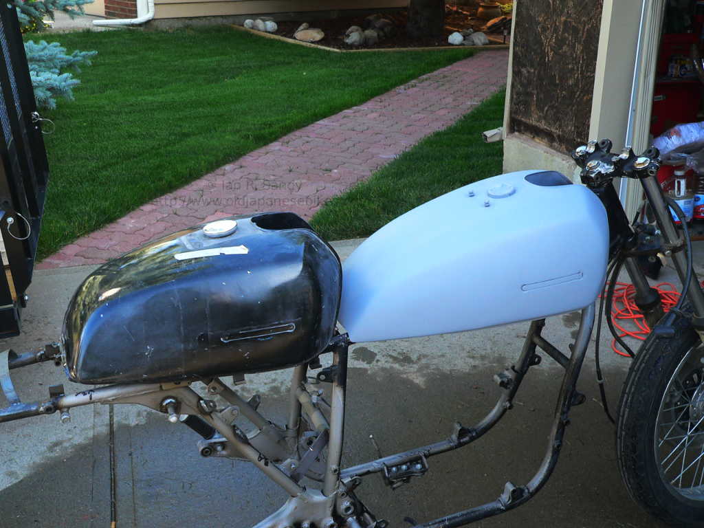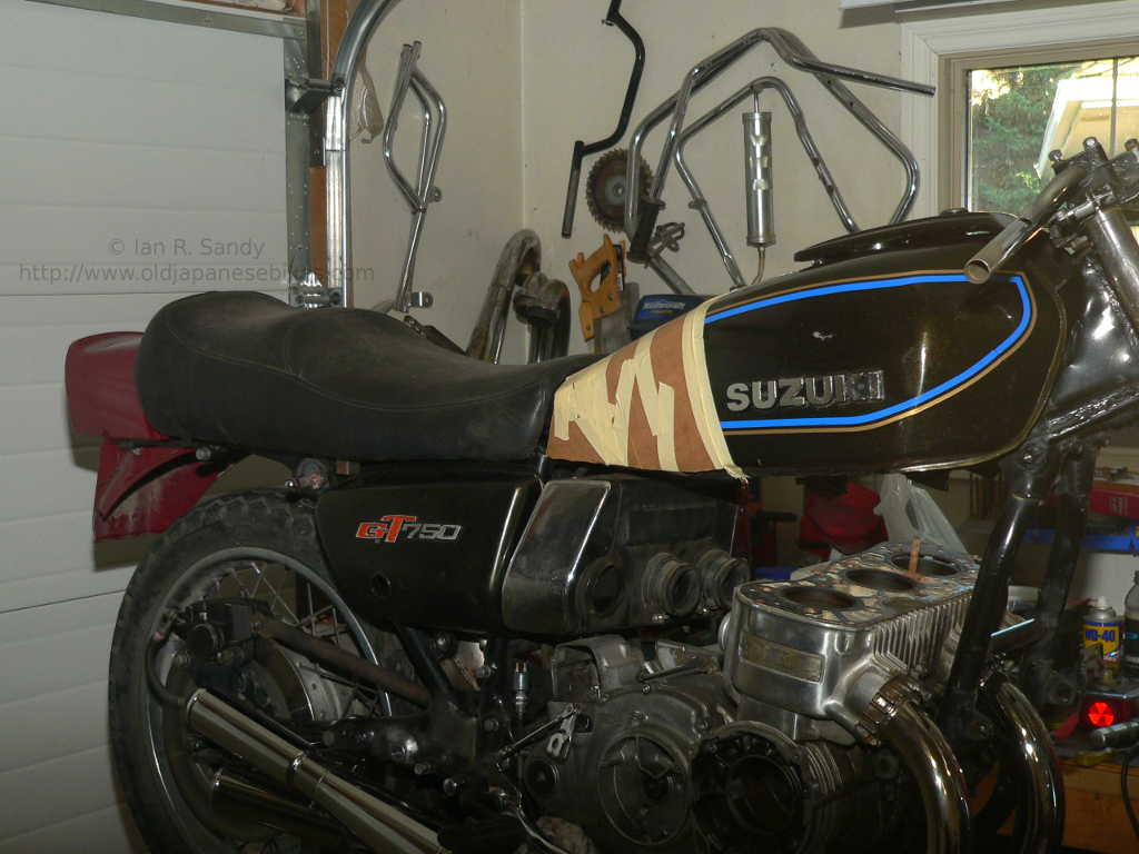 I'm tending toward modifying the tank and have mocked up what it might look like in the photo below. Lengthening the GT750 tank actually makes it about the same length as a GS750 tank, and together with the rear deck makes it appear a bit more modern.. At the moment, I'm waiting for a few parts to arrive before finalising the changes, but I expect to make a decision in about two weeks.