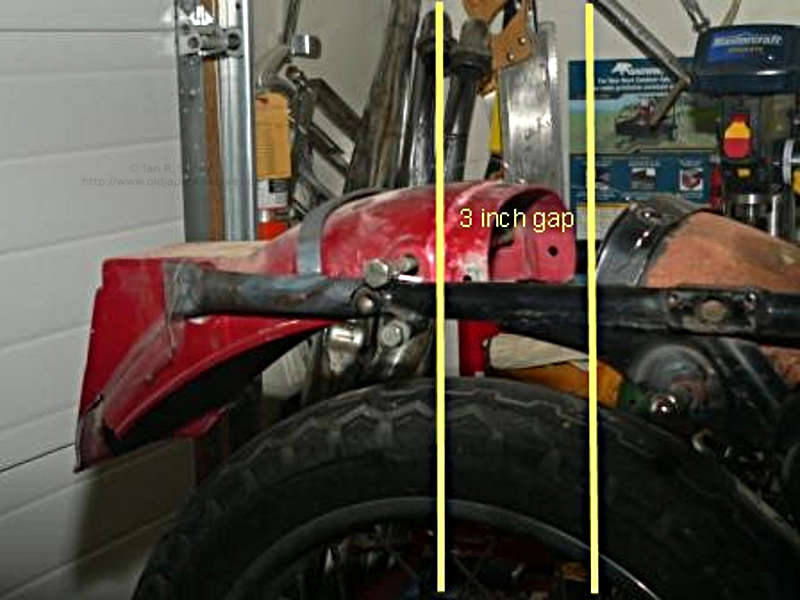 As mentioned earlier there are a few snags resulting from having decided to do the rear disc conversion using the GS swing arm. Although both models have about the same overall length (87.2 inches or 221.5 cm for the GT750 versus 87.6 inches or 222.5 cm for the GS750) the GS750 swing arm is roughly 3 inches (or about 8 cm) longer than the swing arm on the GT750, and has just over an inch (3 cm) of additional wheelbase . I suspect this is a good thing, as it should improve the tracking and overall handling, and also there is room now to perhaps install a larger rear tire. The downside is that the arc that the rear wheel travels doesn't look right with the stock GT750 rear fender, and as well it also means there is no easy way to use a stock GT750 exhaust system as the indents for the rear axel nuts are in the wrong place (too far forward). I had planned to use a rear deck and fender off a 1978 GS750, and luckily I had a set of aftermarket Gibson pipes I could use in place of the stock exhaust so I did not initially think this would be a major problem, however I was wrong. In the end, it did result in a number of frame modifications being required for the rear fender mount, the seat and the tank, as well as of the tank itself.