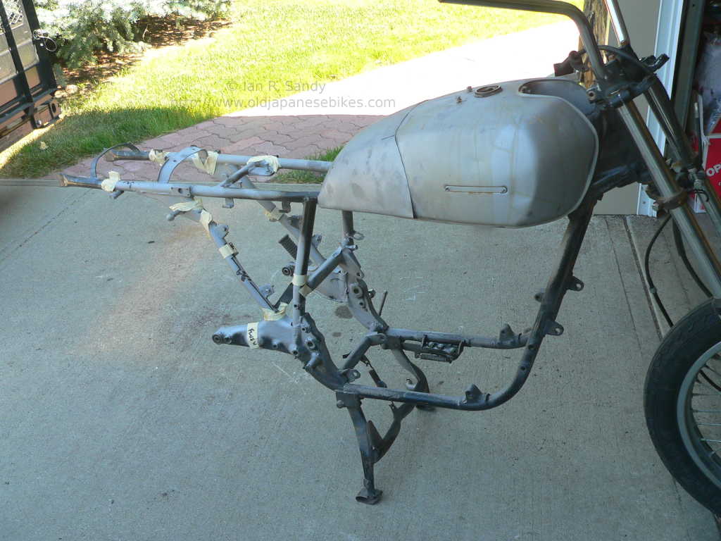 The frame with the tank extension and the mounting tabs has been sandblasted (you can read about that here) and I've included a photo to the left of how it looks currently. The masking tape that you can see marks the location of the new tabs and mounting points for the relocated inner and rear fenders, rear deck, seat and new master cylinder for the new rear disc brake.