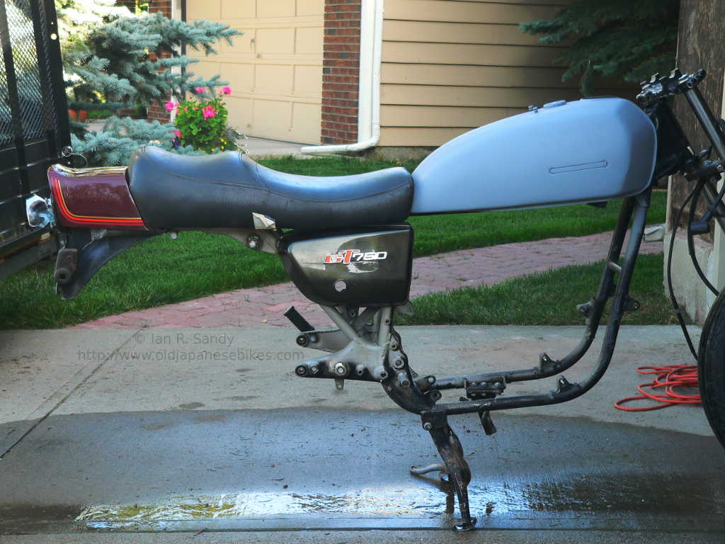 I have finalised the design, and have arranged to take the frame in to The Welding Shop here in Calgary - the tank will have to be steamed out before welding, but this isn't too difficult to arrange. I have cut off all the tabs for the GT750 inner fender mount, as well as the old seat hinge mounts and have either created new mounting tabs based on the GS750E measurements, or have adapted/modified GS750E mounts to suit. At the moment, I'm just waiting for Cactus Machine to finish the work on the new brake lever as they have the sleeve which is to be welded in for the rear brake actuator.