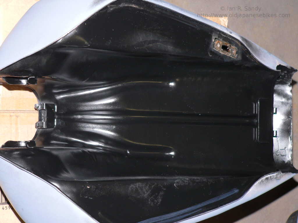 - The GT750 tank has several ridges on its underside that are difficult to get well coated inside the tank. You can see them in the photo to the right running left to right in the area of the tank that would sit immediately above the frame. I used a small brush, and tried to coat what I could reach as best I could through the filler opening, but I suspect this was not entirely successful