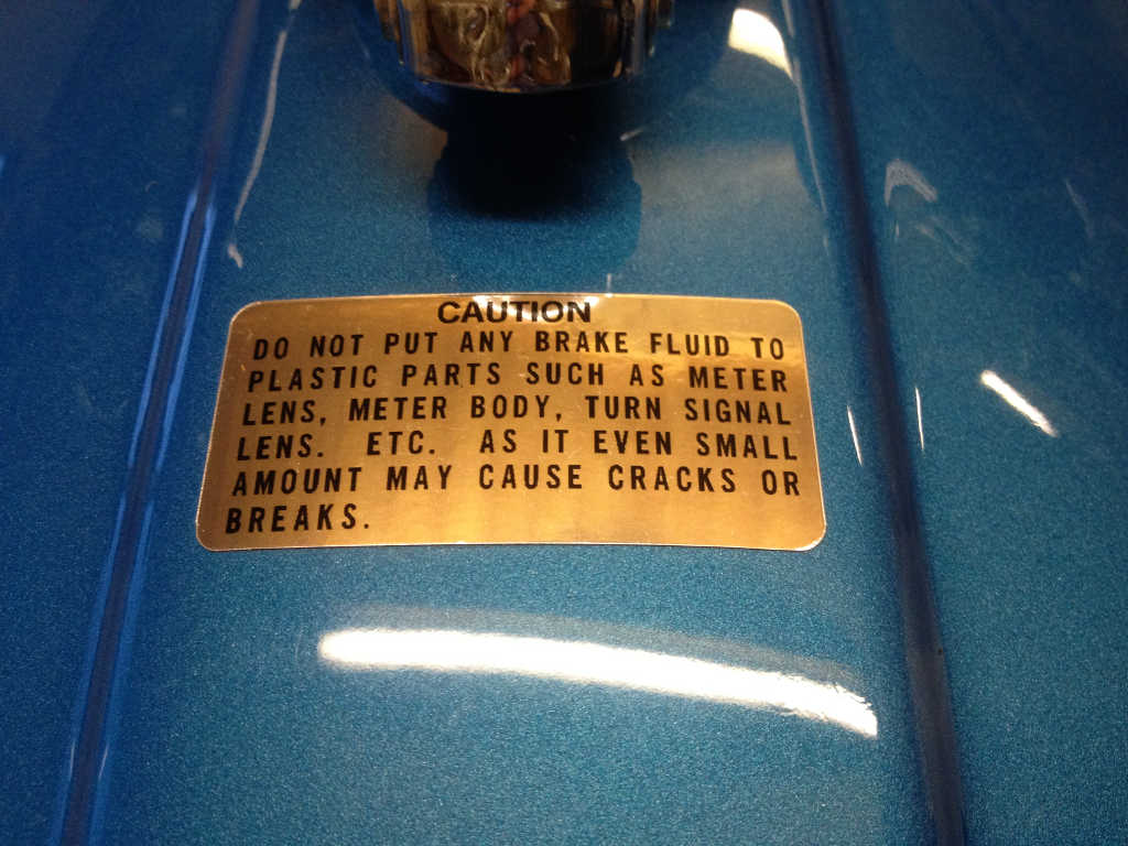 - A warning label (68319-19000) was added to the fuel tank (for models K through B) concerning potential damage which could be caused by brake fluid.