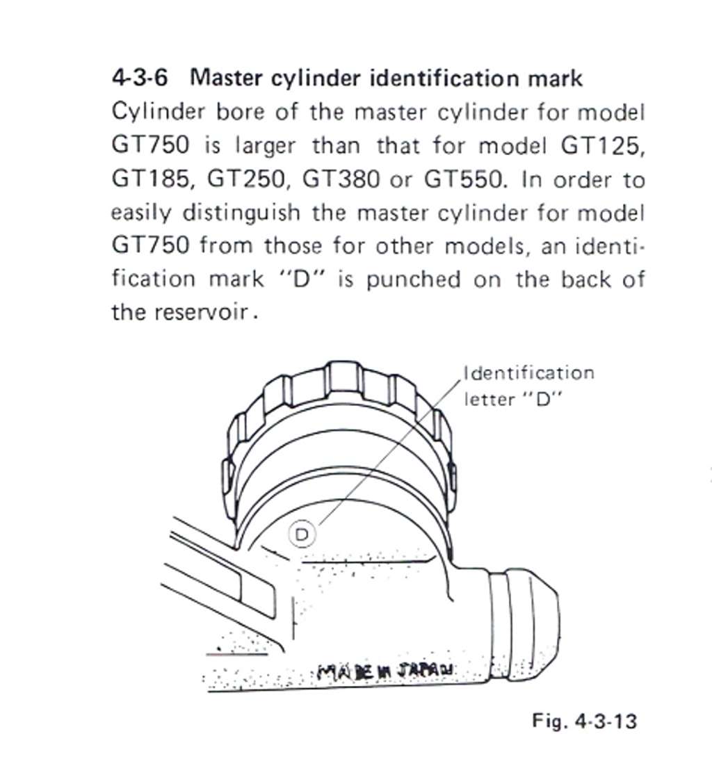 It is worth mentioning, that the master cylinder for the GT550 and GT750 look quite similar, however the dual front disc GT750 master cylinder has a 'D' stamped on the underside as covered in the Suzuki Disc Brake Manual, which can be viewed at this link.