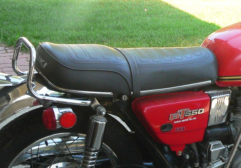 - New frame side covers to integrate with the new air box mentioned above. The covers are secured with screws or a black plastic headed thumb screw having the Suzuki 'S' in the middle, and had 'Suzuki Motor Co. Ltd' in white gloss on clear Mylar tape below the 'GT550' logos. The right side cover also had a 'CCI' label.