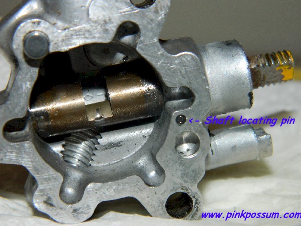 The top cover, like the rest of the pump, is not designed to be serviced by the owner. In theory, that makes sense, but in the real world where some of use are trying to keep these ancient relics fully operational, there has to be a way to service the pump top cover. The top cover consists of a shaft with lever plus locating hardware (washers, springs and a loctited nut). The adjusting shaft is located by a small 1.5mm diameter steel pin. There is also a small oil seal set into the shaft to prevent leakage along the shaft.