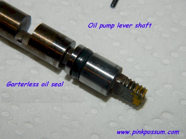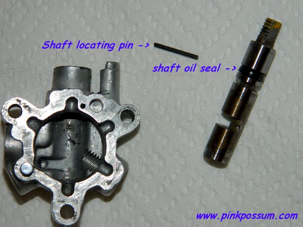 Old pumps often leak a little along the shaft, and when they do, the only solution is to strip the top cover and replace the oil seal. Unfortunately Suzuki never supplied parts for the pump, but some items (gaskets for example) are available from third parties.