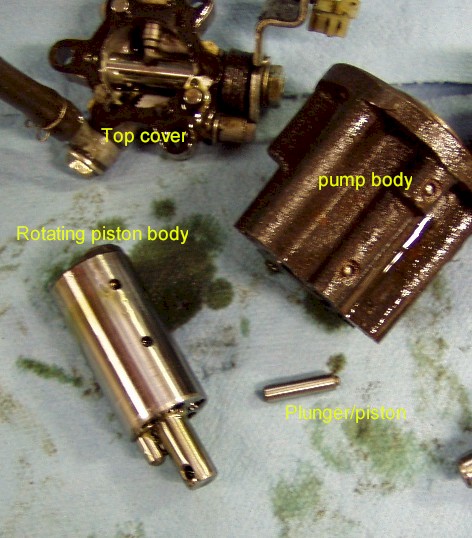 The third sub assembly is the pump valve as it's called by Suzuki. It's a hardened ground steel cylinder containing six ports or passageways and looks much like the revolver of an old six gun. Into two of those chambers are pistons or plungers in Suzuki nomenclature. The pump valve is referred to in this document as the ROTOR, and the plungers as PISTONS.