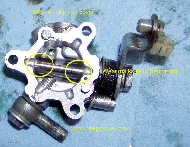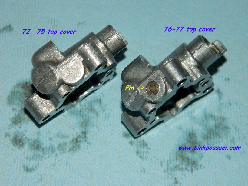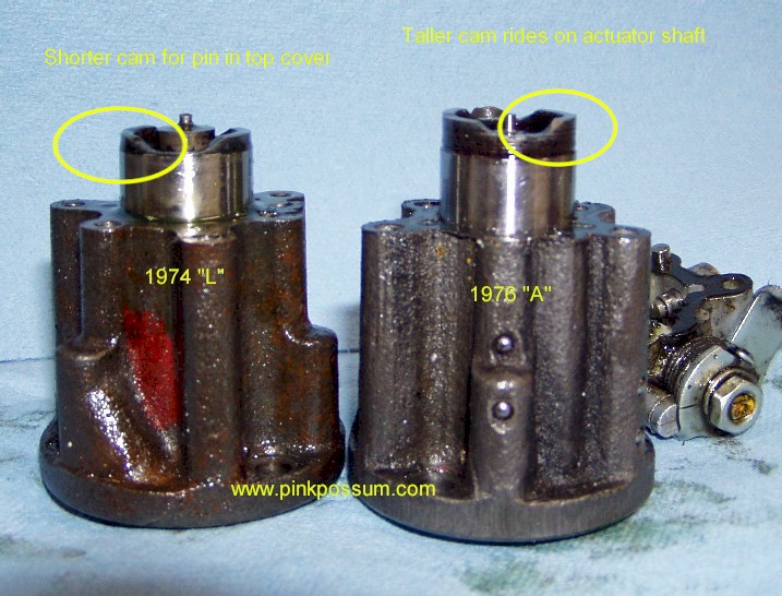 The 1974 L model pump shown below left, uses a hardened pin in the top cover. The 1976 A model pump shown below right, dispenses with the pin and the valve body face cam acts upon the actuator shaft.