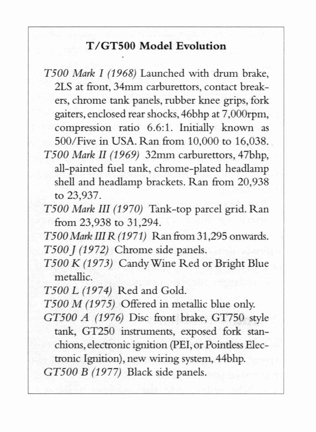 Note - in the Japanese domestic market, this was called the GT500 and the first frame is shown as being T500-37225. Refer to the copy from the parts manual above right. The last JDM machine (per other JDM parts manuals) appears to have been T500-51588.The GT500 is not shown in the JDM sales material I have for 1974 onwards.