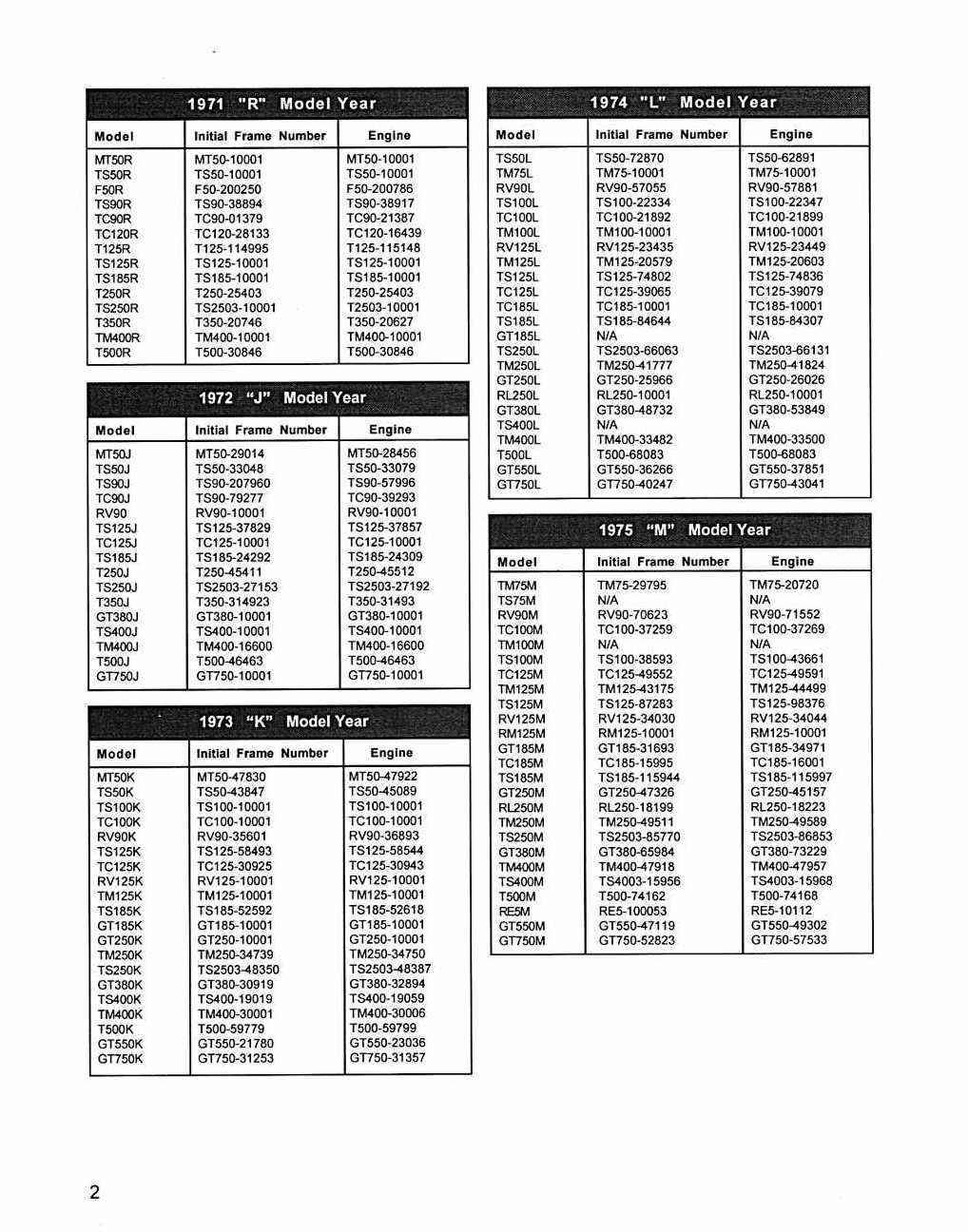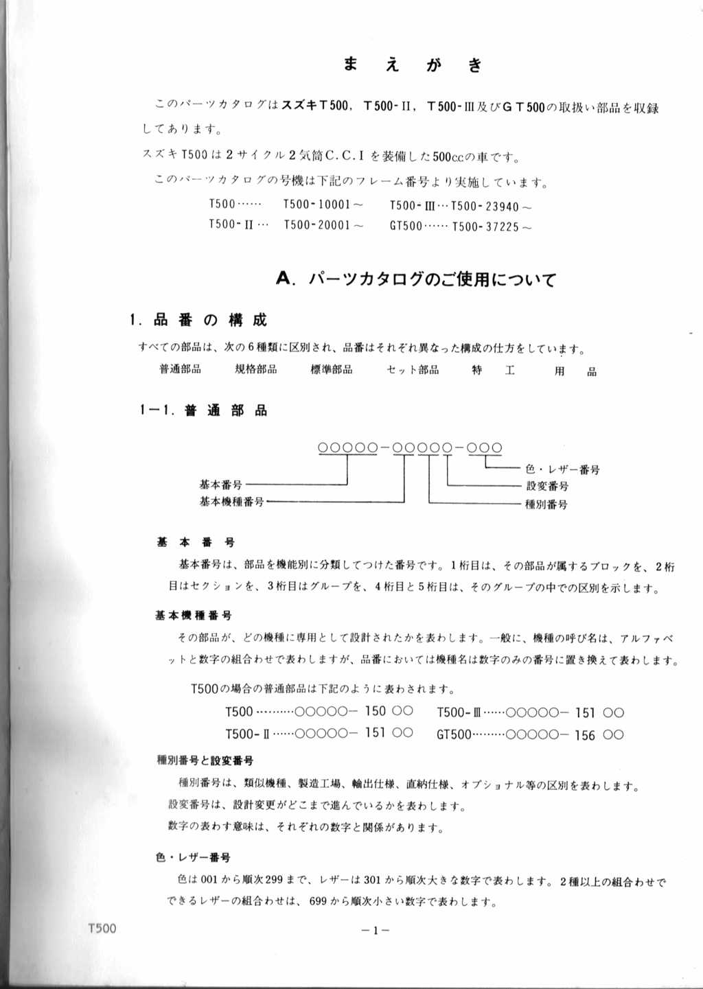 Frame T500-20001 (source - Japanese domestic market parts manual shown to the right - just 'click' on the image for a larger version). Note that Suzuki ordered the photos incorrectly in the manual and swapped the MK II and MK III images - the contents of the parts manual are correct. Mick Walker gives a starting number of 20938 (page 94) which seems unlikely and I suspect it is a typo.