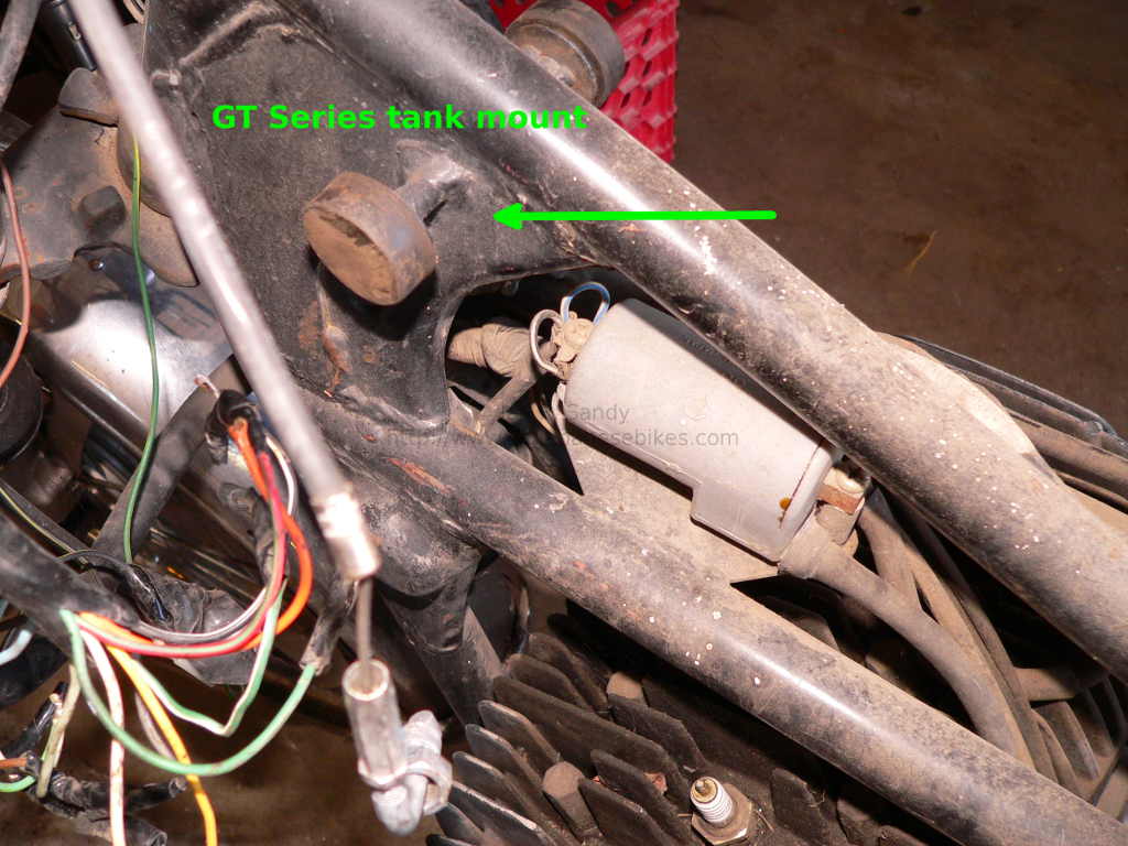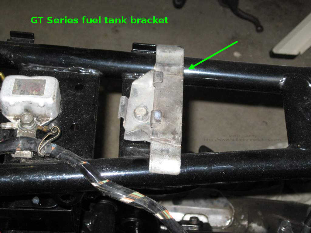 - The tire pump mounting lugs are missing on the GT500A/B frames, and the forward tank mounting lugs are mounted in a different location. The GT series also uses a GT750 style rear tank mount.