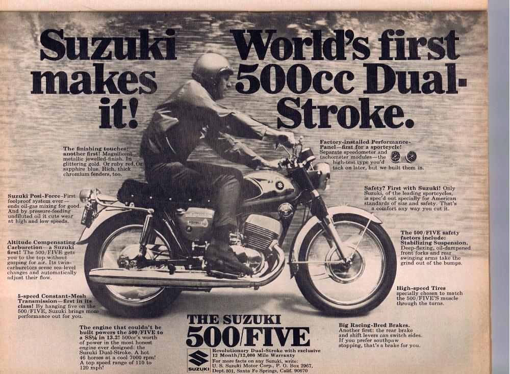 - Suzuki described the T500 as being 'the world's first 500cc dual stroke' which of course was not the case at all. It is true to say it was the first mass high volume 500 cc twin.