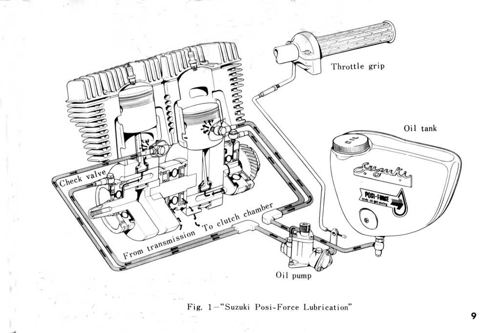 - Controlled by the throttle load and speed-dependent oil pump which fed a piped distribution system responsible for the lubrication of the crankshaft and the cylinder surfaces. The massive centre bearing is lubricated by transmission oil.
