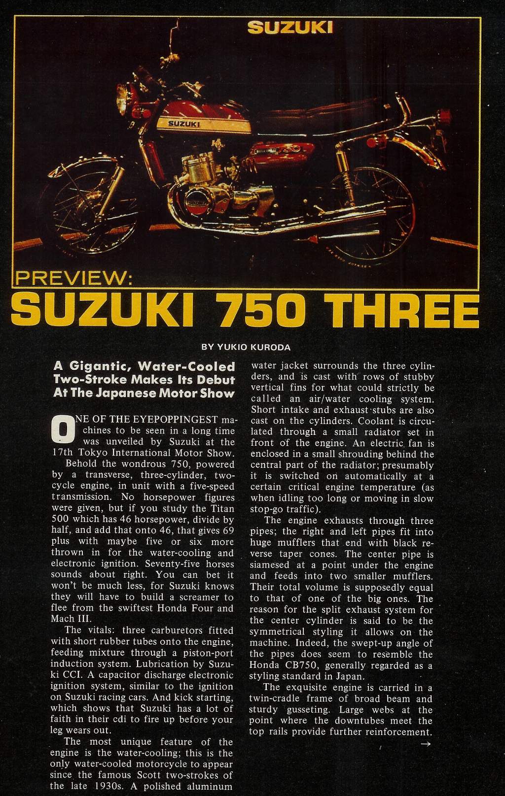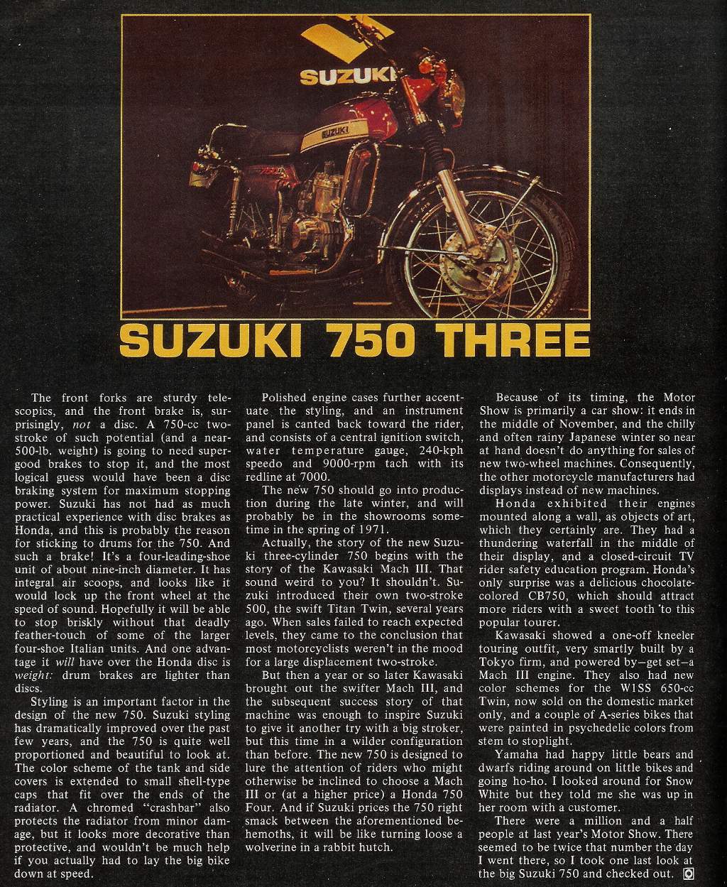 The unveiling of the GT750 at the October 1970, 17th Tokyo International Motor Show. The model went on sale in Japan in 1971 and internationally in 1972. Note some of the details mentioned in the article and shown in the photos:
