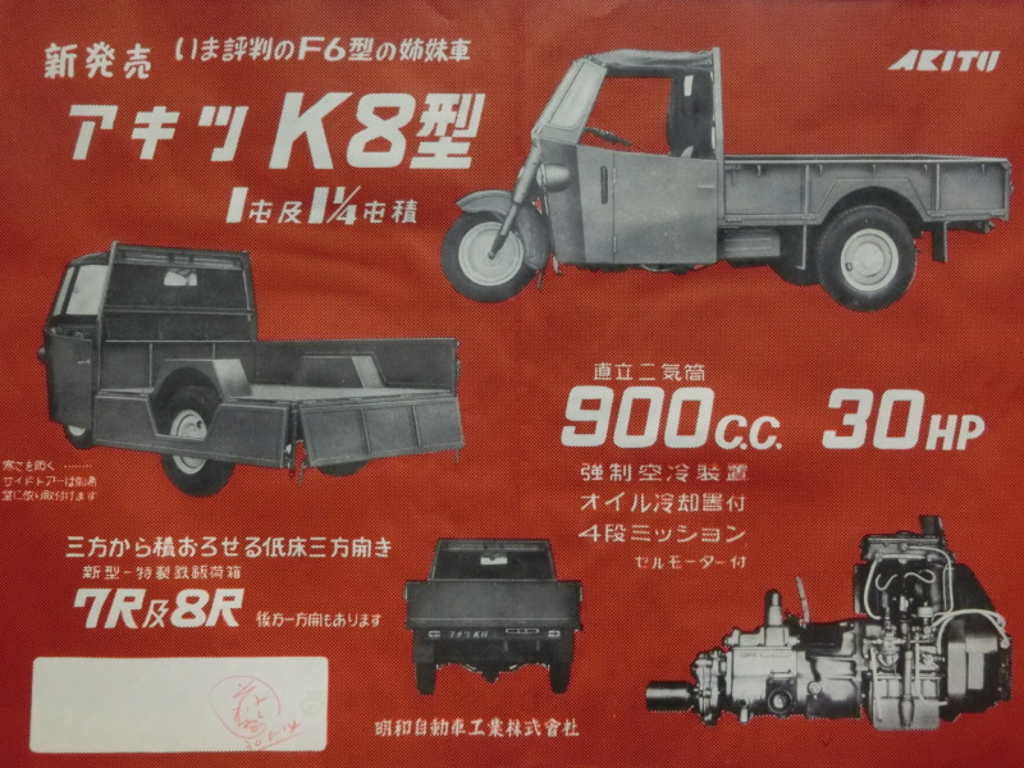 Meiwa Vehicle made a small three wheeled vehicle called the Akitu, or Akitsu ( アキツ号 ) which started life with a 670cc SV single cylinder 4 stroke engine. Later models had 900c and 1500cc engines. The Akutsu retained the handlebar steering and motorcycle style controls till the end of production, rather than having a steering wheel like other similar small utility vehicles of its time, which is why it is included here.