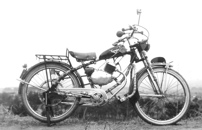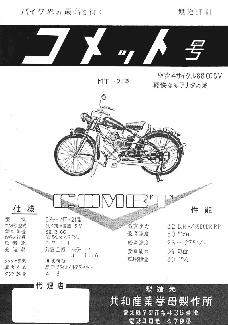 Kyowa Sangyo produced a small moped in 1953, and according to Yaplog, only 200 units were built. The model was called The Comet ( コメット号 ), and I liked the sales pitch of "バ イ ク 界 の 最 高 を 行 く" in the top left corner of the advertisement, which roughly translates as "Go the highest in the motorcycle world". It used a 4-stroke, single cylinder SV 90cc engine, developing a claimed 3.2 HP and came with a 2 speed transmission.