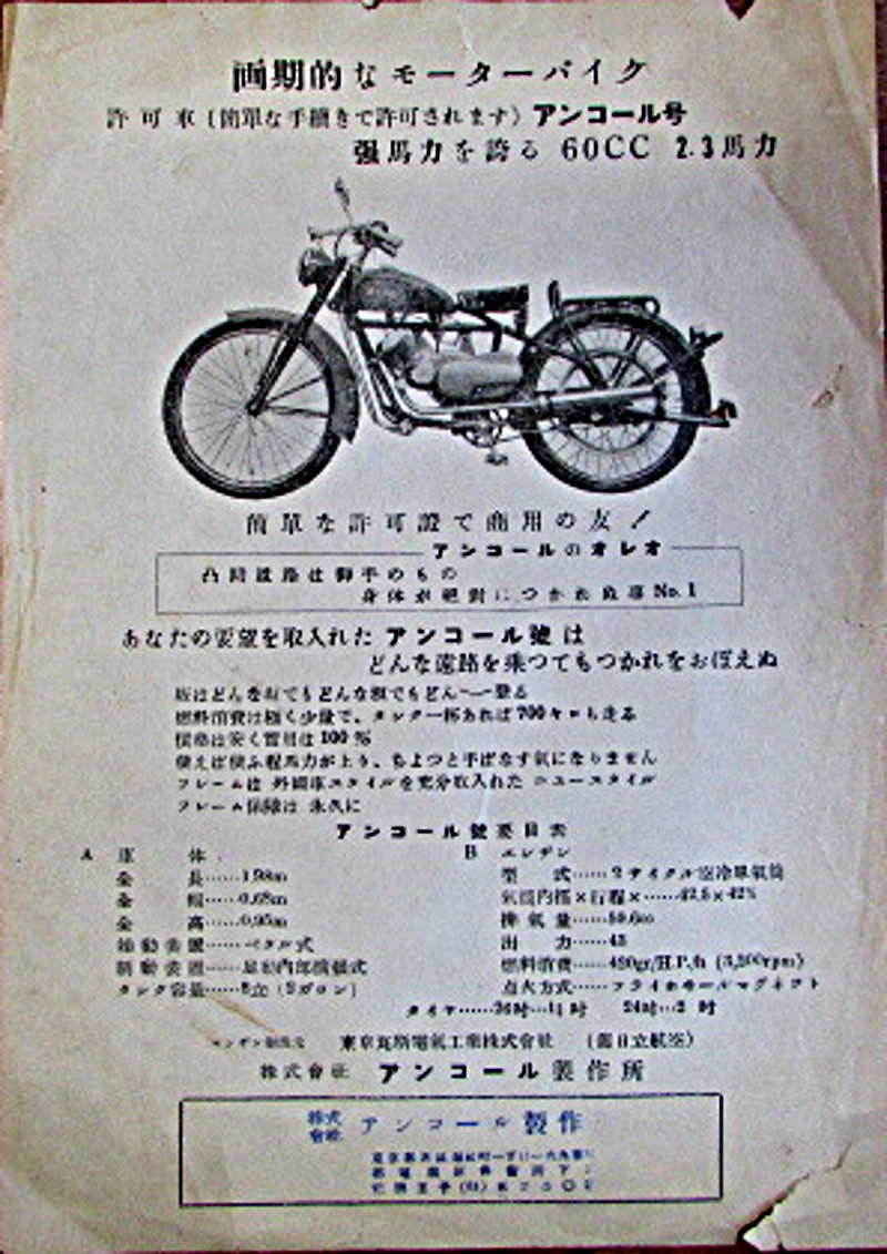 Ocean Wheel in 1954 produced a line of machines called the Encore (アンコール号). The 60cc E used a Fuji Industrial Co., Ltd. (富士工業株式会社) 2 stroke, 60cc engine putting out 3 HP at 5500RPM. It had a 2 speed gearbox, and a top speed of about 60KPH. In addition, there was a type F 60cc, a type N 98cc and a type A 125cc.