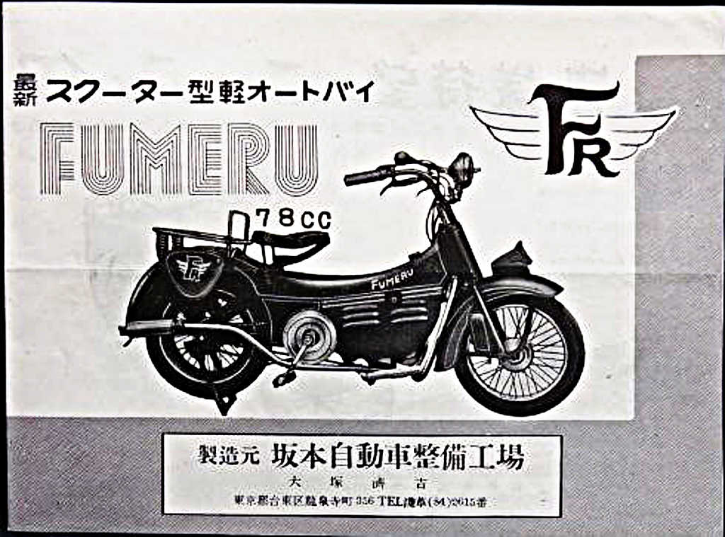 Mike was kind enough to send me this scan. Possibly another one year only make, the company Sakamoto Automotive in Taito Ward (Tokyo) made a very stylish little 78cc moped called the Fumeru. No other data is available currently.