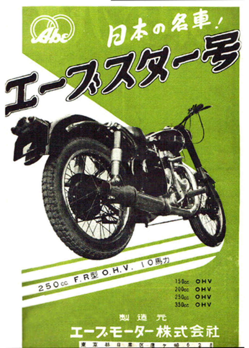 Abe Rihachi had been employed by Meguro Motorcycle prior to WWII and post war he founded the Abe Motor Company in 1950 initially producing the Abe Star A1 which was a single cylinder 142cc four stroke. As with later models, it carried his name on the tank and the engine timing cover. This first offering was followed by: