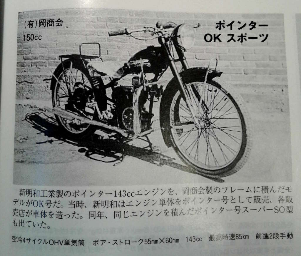 Oka Shokai is listed in the Japanese language wikipedia site, and is also listed on page 138 of my copy of the Japanese Motorcycle History, 1945-2007. It appears to be a one year only company and the text under the photo indicates that it used a single cylinder, OHV 148cc Pointer engine with a two speed gearbox made by Shinmeiwa Kogyo Co., Ltd which they installed in a frame of their own design. The machine was called the Pointer OK Sport (ポインター OK スポーツ号).