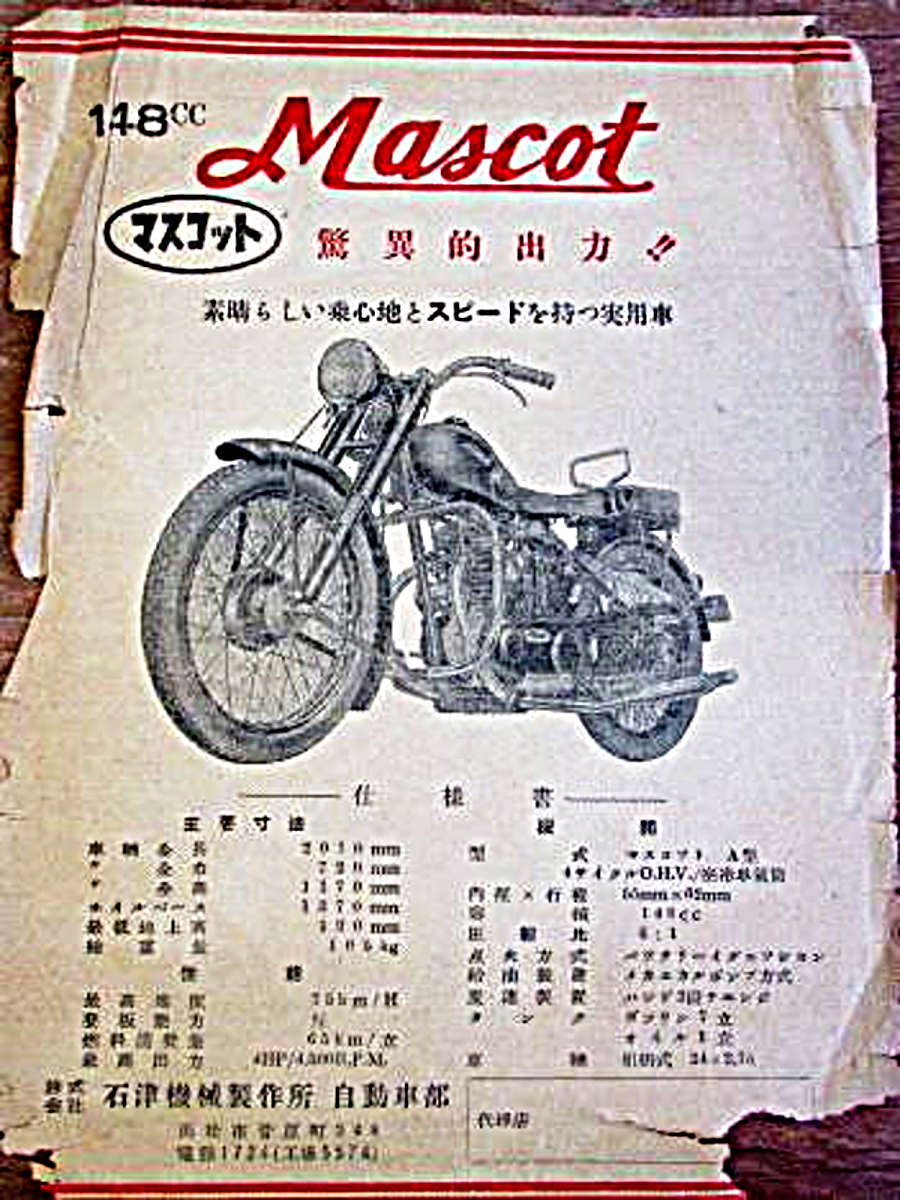 Ishizu Machinery produced possibly two machines, called the Mascot (マスコット号) and perhaps also the Prince Mascot (プリンスマスコット号). The Mascot used a 148cc four stroke o.h.v engine, most probably purchased from some other manufacturer.